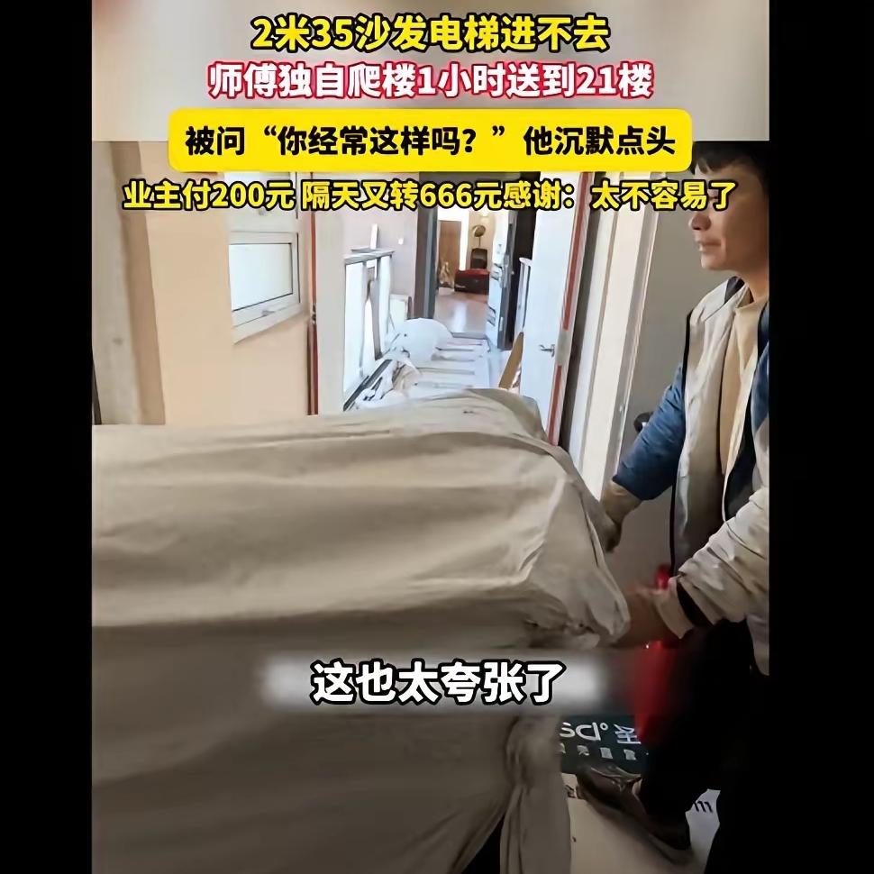 格局真的被这位南京女士狠狠打开了! 2.35米的沙发进不了电梯,90后搬运师傅没推诿、没加价,一个人咬牙背了整整一小时,硬生生爬上21楼。为了保护沙发不被刮蹭,他全程没让货物落地一秒,汗水湿透衣衫,脚步都在发颤,却始终把责任扛在肩上。 我特别认同一句话:体面从不是穿得多光鲜,而是把事做到极致。这位师傅靠力气养家,凭良心做事,不喊苦不抱怨,平凡却格外有力量。 女士的做法更让人暖心,商家已付过费用,她还是当场给200元,隔天又转666元红包。这不是施舍,是对辛苦的看见,对付出的尊重。最好的关系,从来都是你尽心尽责,我懂得感恩。