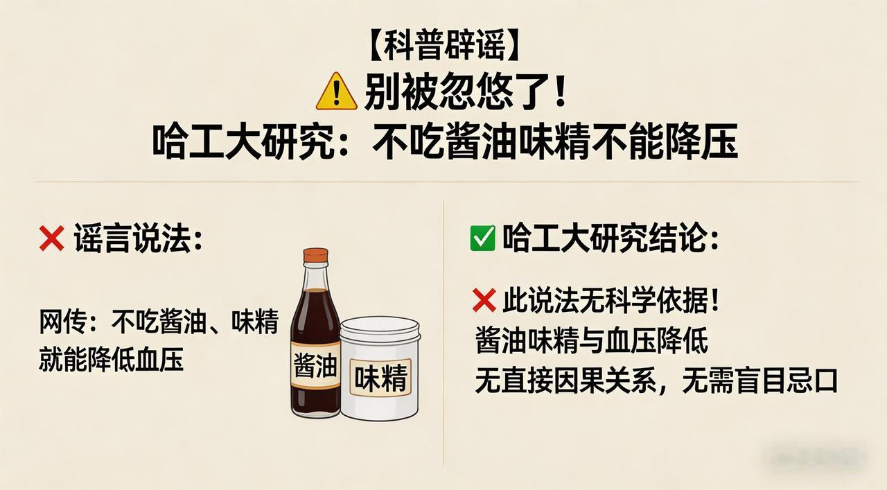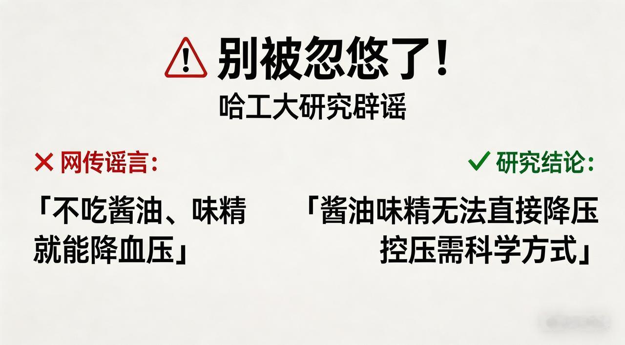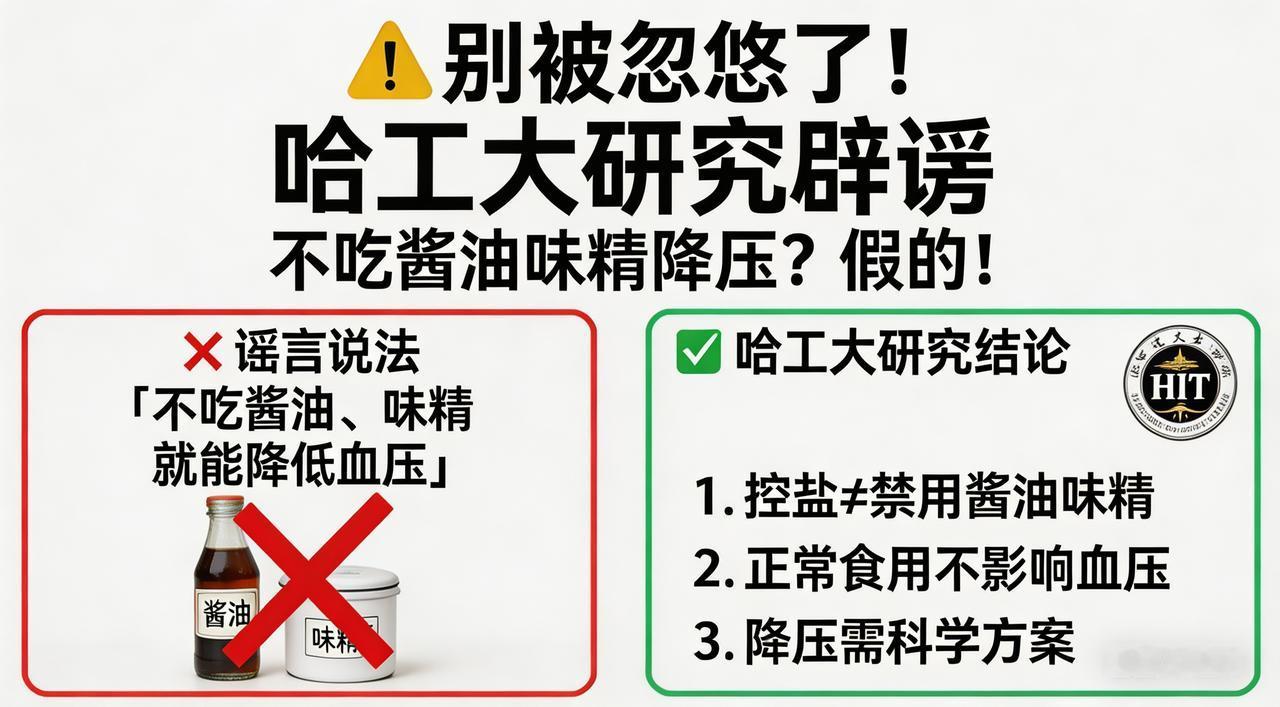 哈工大研究:不吃酱油味精降压?别被忽悠了 哈工大重磅揭秘:不吃酱油和味精,血压真能“断崖式”速降? 在健康话题的浩瀚星空中,总有一些消息如璀璨流星般划过,瞬间吸引众人目光。近日,“不吃酱油和味精,血压马上就降低”这一说法,就像一颗重磅炸弹,在网络健康领域炸开了锅,让无数高血压患者心潮澎湃,仿佛看到了摆脱血压困扰的曙光。可这看似诱人的论断,究竟是科学真相,还是一场虚幻的泡影呢? 哈工大联合哈尔滨医科大学于2024年开启了一场探寻健康密码的科学征程。科研团队如同经验丰富的航海家,精心挑选了3478名中老年人群作为研究对象,深入剖析他们的饮食习惯与高血压发病率之间千丝万缕的联系。研究结果犹如一声惊雷,令人震惊不已:长期大量摄入高钠调味品如酱油、味精的人群,高血压发生率比未摄入者高出近2倍[2]。这一数据,无疑给那些热衷于重口味饮食的人们敲响了一记响亮的警钟。 在一项针对124名轻中度高血压患者为期3个月的饮食干预研究中,奇迹悄然发生。仅仅通过减少调味品中的钠摄入,短短30天内,患者的收缩压平均下降了8.7mmHg,舒张压下降了4.3mmHg[8]。这下降的数值,就像陡峭悬崖上的滑梯,让血压一路“俯冲”而下。还有一项别开生面的实验,让志愿者在两周内完全与含酱油、味精的菜肴“绝缘”,且不改变食盐摄入量。最终,平均收缩压下降7毫米汞柱,舒张压下降4毫米汞柱[5],这一组组数据,仿佛是解开血压谜团的神秘密码,吸引着人们不断深入探究。 然而,血压的变化远非如此简单直接。它就像一个错综复杂、变幻莫测的迷宫,受遗传、年龄、体重、运动量、精神压力等多种因素交织影响[3]。而且,酱油和味精虽含钠,但一顿菜用量有限,真正影响血压的是整顿饭的钠摄入总量。这就好比隐藏在黑暗中的“幕后黑手”,悄无声息地操控着血压的起伏,不容我们有丝毫忽视。 从成分上看,普通酱油每100毫升含钠量约为6600毫克,味精100克中钠含量更是高达12000毫克[2][5]。中国营养学会推荐每日钠摄入量不应超过2000毫克,可中国人每天摄入钠总量约4000毫克以上,超标部分很大一部分来自厨房调味料[3][5]。这鲜明的对比,无疑凸显了控制钠摄入的紧迫性和重要性。 所以,控制钠摄入对控制血压固然关键,但别指望停用酱油和味精就能“立马见效”。只有系统调整饮食、运动、睡眠等多方面,如同在迷宫中精心绘制地图、寻找出口,血压才可能逐渐平稳,让我们真正迈向健康的美好未来[3][7]。
