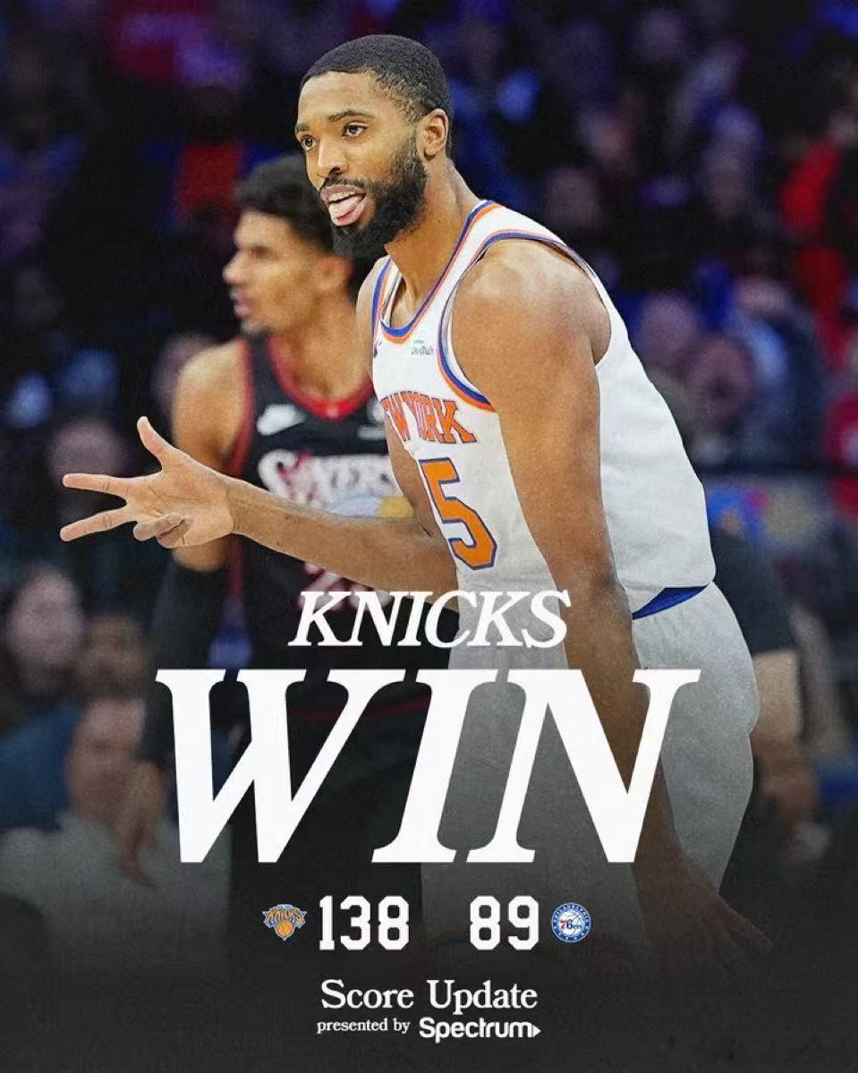 尼克斯49分血洗76人,阿尔瓦拉多26分3板4助5断、布里奇斯22分5板6助2断、唐斯21分11板5助;76人方面马克西32分,恩比德缺阵,VJ14分。