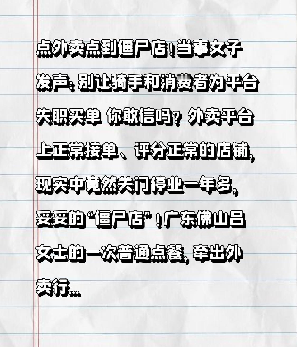 点外卖点到僵尸店!当事女子发声:别让骑手和消费者为平台失职买单 你敢信吗?外卖平台上正常接单、评分正常的店铺,现实中竟然关门停业一年多,妥妥的“僵尸店”!广东佛山吕女士的一次普通点餐,牵出外卖行业惊人漏洞,当事女子亲自发声,真相让全网气愤又心疼。 2月8日,吕女士像往常一样点开外卖平台,选了一家显示正常营业的店铺下单,骑手很快接单赶往取餐。可让骑手傻眼的是,门店大门紧锁、灰尘遍布,早就停止经营,线上线下完全是两副模样。联系商家,对方只轻飘飘一句“让顾客自己取消订单”,就把责任甩得一干二净。 吕女士得知后,第一时间按真实原因提交退款申请,全程配合处理,本以为事情就此了结。万万没想到,离谱转折来了:平台系统未做任何核实,直接判定骑手“超时未送达”,硬生生扣了10元罚款。10元钱不多,却是骑手跑好几单的辛苦钱,空跑一趟还被罚,换谁都觉得冤。 此事曝光后,吕女士正式发声,语气满是惊讶与不解:“平台没及时清理关停一年多的僵尸店,出了问题却让骑手和消费者承担,这明显是管理失职!”她直言,自己点单没错,骑手送餐没错,错的是平台疏于审核,让虚假店铺长期盘踞,把合规风险转嫁给无辜的普通人。 网友们瞬间炸锅,纷纷吐槽自己也遇到过类似情况:下单后商家不接单、骑手到店扑空、退款流程繁琐,最后吃亏的总是消费者和骑手。更让人担忧的是,僵尸店不仅耽误时间,还存在食品安全隐患,万一有不良商家借壳经营,后果不堪设想。 这件事之所以刷屏,戳中了亿万用户的痛点:外卖平台只顾扩张规模,却放弃了最基本的审核责任。线上店铺核验、异常订单监测、骑手权益保障,这些本该平台做好的事,如今全成了漏洞。 当事女子的发声,不只是为自己和骑手讨公道,更是为所有外卖用户发声。平台赚得盆满钵满,就该扛起主体责任,定期清理僵尸店铺,优化异常订单处理机制,别让老实人总受委屈。 外卖便利的背后,是无数消费者的信任和骑手的汗水。希望平台能正视问题,及时整改,退还骑手罚款,补上监管漏洞。别让便利变糟心,别让信任被辜负,让点外卖这件小事,真正安心又暖心。