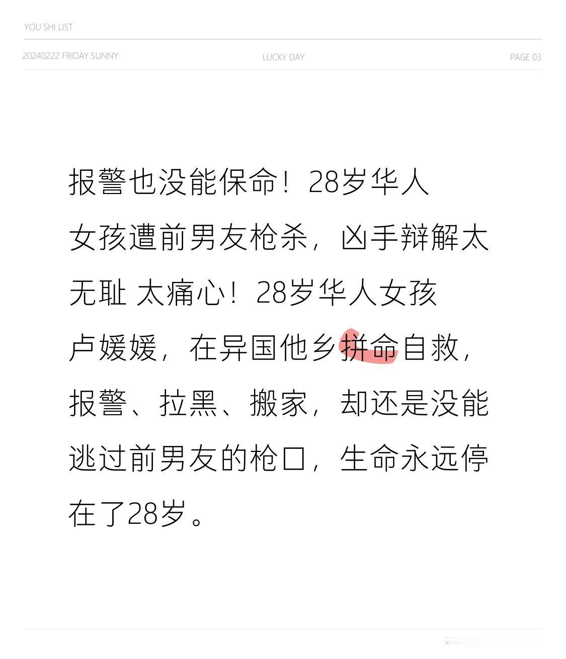 报警也没能保命!28岁华人女孩遭前男友枪杀,凶手辩解太无耻 太痛心!28岁华人女孩卢媛媛,在异国他乡拼命自救,报警、拉黑、搬家,却还是没能逃过前男友的枪口,生命永远停在了28岁。 据警方通报,案发前她已决心分手,拉黑对方所有联系方式,还勇敢走进警局报警,称长期被跟踪、骚扰、性侵,极度恐惧生命安全。可谁能想到,求助没能换来保护,反而激怒了恶魔。 监控画面让人窒息:案发当天凌晨5点多,凶手任宇俊就驾车一路尾随,蹲守数小时后,在车内近距离朝她头部开枪,女孩当场身亡。作案后,他带着律师淡定自首,还编造“想吓唬她、枪走火”的鬼话,企图减轻罪责。 转折来了!警方证据直接戳穿谎言:全程预谋跟踪、精准头部射击,弹道与现场痕迹完全排除“走火”可能。目前,他被控一级谋杀、非法持枪、跟踪骚扰等多项重罪,被拒绝保释,等待他的将是法律最严厉的审判。 一条年轻鲜活的生命,一场精心策划的杀戮,一句漏洞百出的狡辩,刺痛全网。女孩努力自救、勇敢报警,却没能换来生机,这不仅是个人悲剧,更是对亲密关系暴力的沉重警示。 无数网友破防:远离垃圾人有多难?分手就被报复,求助却来不及,女孩子在感情里的安全谁来守护?在海外打拼的华人女孩,独自面对危险,更需要加倍警惕与保护。 这起悲剧告诉所有人:家暴、跟踪、威胁从不是“家务事”,分手暴力更不是小事。一旦感受到危险,立刻远离、保留证据、及时求助,不要心软,不要给恶魔回头的机会。 愿逝者安息,愿凶手重判,愿每一个独自在外的女孩,都能被世界温柔以待,远离伤害,平安一生。