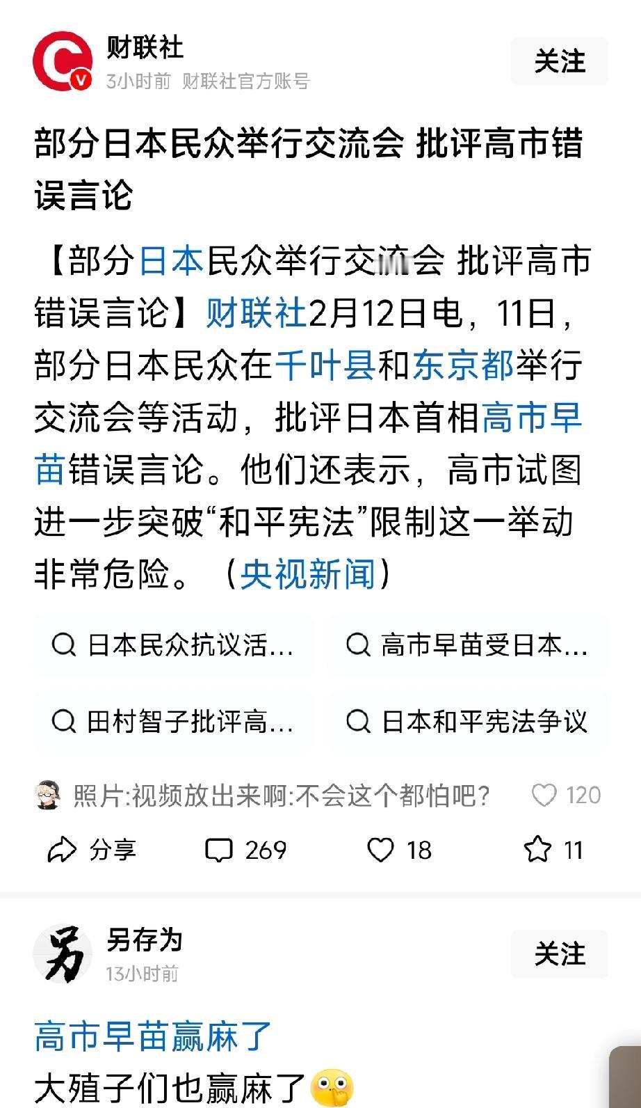 日本民众举办交流大会,批判高市早苗的错误言论。竟有人称这些民众被外部势力渗透,是日本的“恨国党”,还说他们是在妄议国策。真希望日本能多些这样的人,我们很愿意看到。