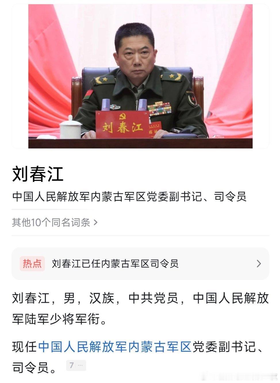 刘春江已任内蒙古军区党委副书记、司令员。