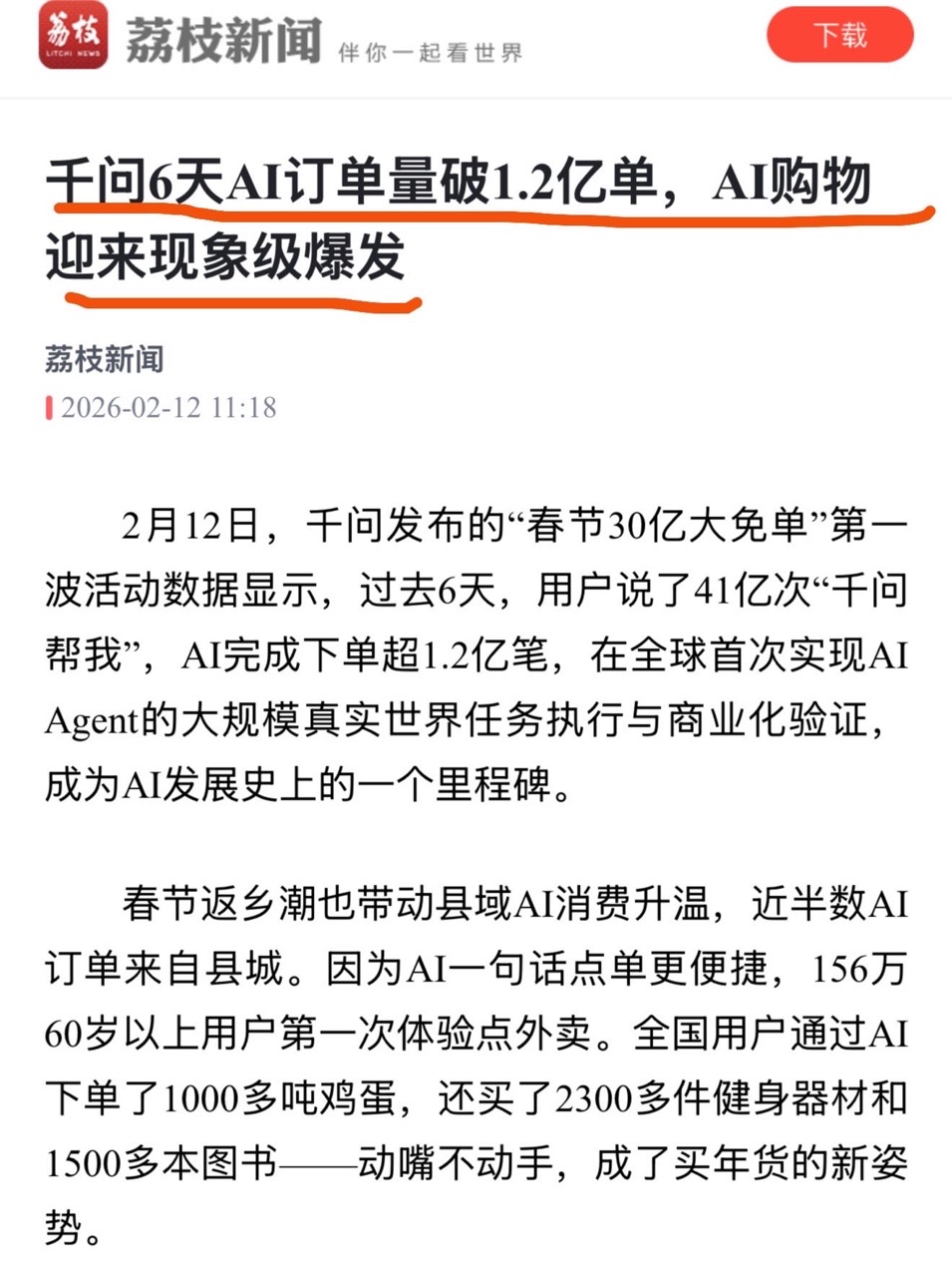 刚刚看到媒体报道,2月12日,千问发布的“春节30亿大免单”第一波活动数据显示,过去6天,用户说了41亿次“千问帮我”,AI完成下单超1.2亿笔。