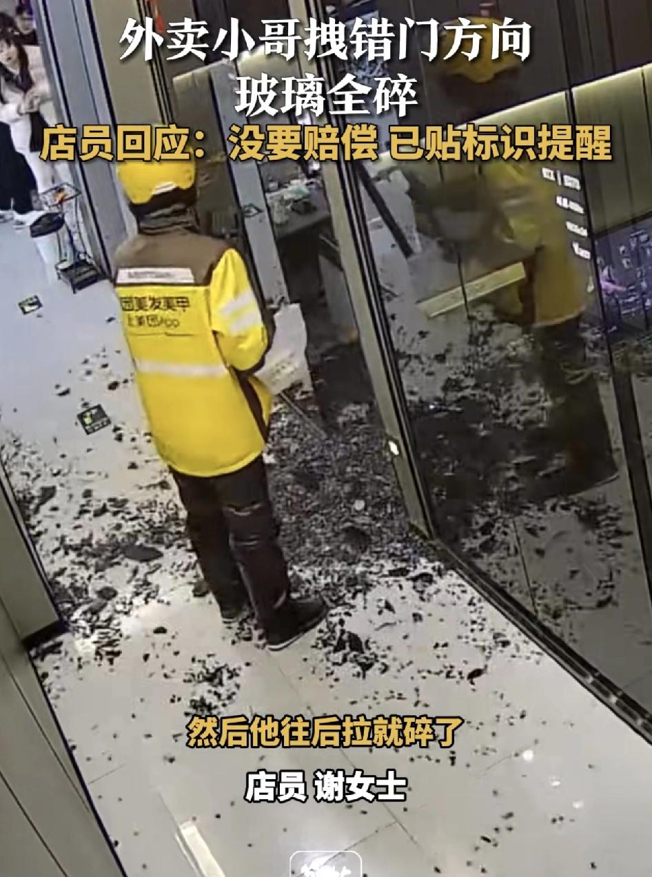河南商丘一外卖小哥送外卖到一商场里面,商家的门是一扇玻璃门,外卖小哥往后拉,玻璃门瞬间碎掉,店员称,这个门应该是往左边推拉,然后外卖小哥是往后面拉,开门方式不对导致一面玻璃全碎,这应该是谁的责任,店员说没有让外卖小哥赔偿,不过后面已经挑了警示的标识。网友们觉得这样的玻璃门质量肯定有问题,不可能因为方向不对,拉一下就全碎了。