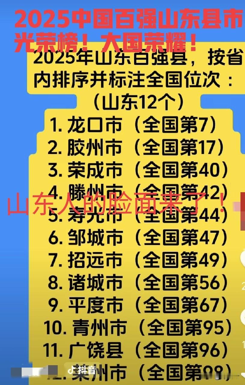 最能代表山东省的是哪一个城市山东人的荣耀来了!2025年中国百强县市—山东省光荣榜出炉!提起山东人,我想到了龙口粉丝、寿光蔬菜等等!你觉得山东脸面是哪里?2025年中国百强县市揭晓,山东十二城登榜封神,龙口领跑北方、胶州雄踞胶东、寿光菜满天下、招远金耀九州,一城一风骨,一县一传奇!速速围观揭秘详细内容![烟花][烟花] 一、山东人的荣耀,刻在骨血里 山东之强,不在一城独大,而在群星璀璨;山东之荣,不在虚名在外,而在实业兴邦。从渤海之滨到运河之畔,从泰山之阳到黄河之尾,每一寸土地都生长奇迹,每一座县市都锻造传奇。外人知山东有孔孟礼义、泰山巍峨、大海苍茫,更知山东有硬核产业、金字招牌、实干脊梁。今日且看,百强榜上山东荣光,谁是真正山东脸面。[烟花][烟花] 二、龙头昂首:龙口——江北第一县,山东顶流门面。龙口者,山东县域天花板,北方唯一全国前十,赛迪榜单稳居第七,以一县之力,傲立群雄之巅。此地不只有海产丰饶、工业强盛,更有龙口粉丝香飘四海,银丝柔韧,久煮不烂,被誉为“人工鱼翅”,从餐桌小食走向国际大牌,是山东走向世界的味觉名片。[赞][赞] 三、金都传奇:招远——黄金与银丝,双璧耀齐鲁。[给力][给力] 招远与龙口,一衣带水,同登百强,共铸烟台辉煌。招远者,中国金都,黄金储量与产量冠绝全国,地下藏金山,地上铺锦绣,每一块金砖都刻着山东实力。 四、菜都王者:寿光——中国菜篮子,世界菜园子 寿光一登场,天下餐桌香。此地是农圣贾思勰故里,中国蔬菜之乡,以一县之耕,养亿万国人之口。大棚连阡陌,蔬菜四季鲜,从黄瓜番茄到珍馐菌菇,从田间地头到全国商超,寿光蔬菜定义新鲜标准,引领农业科技。[微风][微风] 五、枢纽雄城:胶州——青岛门户,海陆通衢!胶州踞青岛咽喉,扼胶东枢纽,百强榜高居第十七,是胶东半岛硬核实力派。此地自古商贸繁荣,港口联动,物流通达,制造业根基深厚,商贸活力迸发。[彩虹][彩虹] 六、鲁军全阵:十二强县市,各领风骚 - 荣成:滨海明珠,渔业强市,海鲜鲜美,生态宜居,山东海洋经济脸面。 - 滕州:鲁南重镇,历史悠久,工业扎实,民生繁荣,山东南部门面。 - 邹城:孟子故里,文化与经济齐飞,儒风浩荡,产业兴旺,山东文化经济双脸面。 - 诸城:产业重镇,制造强市,品牌辈出,山东工业制造脸面。 - 平度:青岛后花园,农业与工业并进,物产丰饶,潜力无限。 - 青州:古州风华,文旅兴盛,产业稳健,山东历史与现代交融脸面。 - 广饶:工业强县,民营经济活跃,山东制造业中坚力量。 - 莱州:滨海古城,物产丰饶,产业均衡,胶东半岛稳健门面。 十二城同心,齐鲁魂一体,或工业称霸,或农业称王,或商贸通达,或文旅扬名,或资源富集,或制造精良,无一处虚位,无一城虚名。 七、山东脸面,不止于榜,在于魂[锦鲤到来][锦鲤到来] 何谓山东脸面?不是高楼林立的浮华,不是虚名在外的张扬,是龙口的实干、招远的坚守、寿光的创新、胶州的担当;是粉丝的柔韧、蔬菜的鲜活、黄金的厚重、制造的坚实;是孔孟礼义的温良,是泰山压顶不弯腰的倔强,是大海纳百川的胸怀。 山东脸面,是龙口粉丝的丝缕绵长,是寿光蔬菜的四季常青,是招远黄金的恒久价值,是胶州物流的通达四方;是鲁花的浓香、张裕的醇厚、青啤的清爽;是潍柴的动力、海尔的智慧、海信的精湛;是每一个山东人厚道、实在、肯干、不服输的精气神。 八、齐鲁风正劲,荣光再启程[招财进宝][招财进宝] 海岱雄风,千载传承;百强登榜,今朝峥嵘。2025山东百强县市,是成绩单,是新起点;是实力证,是荣耀书。龙口昂首,招远生辉,寿光飘香,胶州扬帆,十二城并肩,齐鲁共辉煌。 山东脸面,在产业,在品牌,在风物,更在人心。愿齐鲁大地,岁岁常强盛,年年谱新篇;愿山东儿女,守厚道本心,展大国风采,让山东脸面,光耀华夏,名扬四海! 欢迎关注@叮咚云 将优先为粉丝职业规划指导,为你定制最适合的就业择业方案!欢迎留言交流讨论。[来看我][来看我] 免责声明:图片来自网络,仅供参考! 山东城市排行