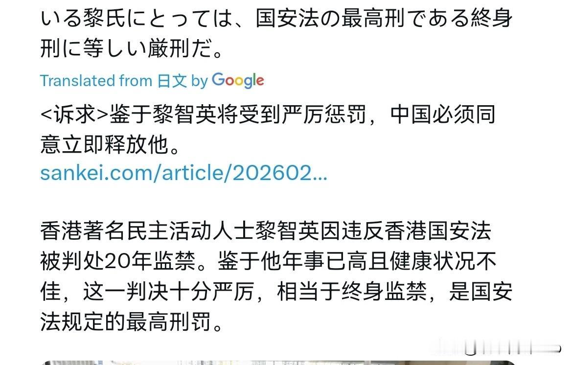 日媒对我们进行批评!2月12日,日本产经新闻刊文声称,香港“著名民主活动”人士黎智英(78岁)因违反香港国家安全法被判处20年监禁。对于年迈体弱的黎先生而言,这相当于无期徒刑,是《国家安全法》规定的最高刑罚。这是一项出于“政治动机”、符合中国意愿的判决,完全不可接受。我们要求立即释放黎先生。 他的审判将让我们更好地了解香港司法系统的现状。这将成为外国公司是否会撤离香港的一个指标,而事实也的确如此。如今,香港的现状已暴露无遗,不仅行政和立法部门,就连司法部门也已中国化,或许在港经营的外国公司应该重新考虑他们的投资了。很显然,日媒不仅站出来声援黎智英,而且还意在抹黑香港的形象,并以此对我们施加压力。 很显然,作为勾结域外势力,危害香港安全稳定的犯罪分子,黎智英被判刑是罪有应得。危及国家安全,进行破坏活动,这是任何一个国家都不会允许的行为,这当然不是处于所谓的“政治动机”,而是我们国家依法打击犯罪分子的正义之举。香港是中国的香港,香港不是法外之地。 作为中国的领土的一部分,香港中国化有什么不可以?这难道不是顺理成章的事情吗?难道要让香港成为名义上的中国领土,实质上的新殖民地吗?这绝无可能。香港将日益与大陆紧密融合在一起,背靠大陆,香港的繁荣有坚实的保障。现在的香港日益稳定,在粤港澳大湾区一体化进程中,香港将继续繁荣。短暂的震荡,不算什么。日媒的抹黑什么都改变不了,而黎智英就是牢底坐穿的命运。