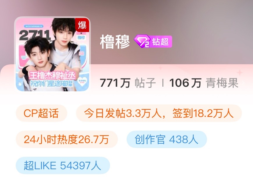 橹穆超话连爆2天了橹穆超话今天又爆了🔥连爆2天,这热度太顶了🩵🩷醒图 橹穆