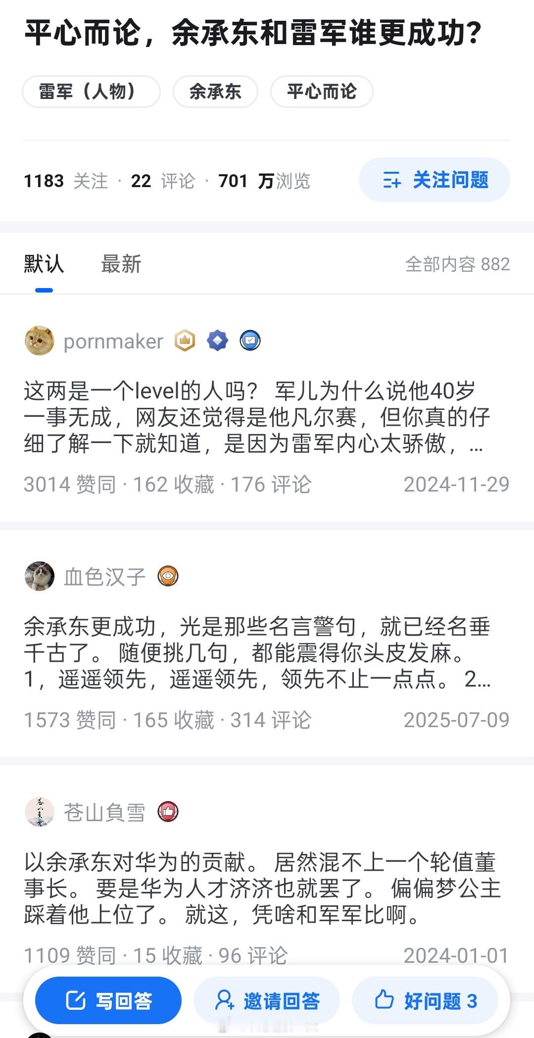 知乎这个话题争论的很厉害,余承东和雷军谁更成功?