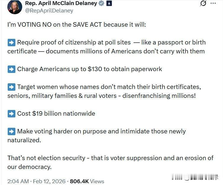 众议员 April McClain Delaney 发文反对《拯救法案》。 “我将对《拯救法案》投反对票,因为该法案将: ➡️ 要求在投票站出示公民身份证明——如护照或出生证明——这些是数百万美国人不会随身携带的文件 ➡️ 向美国人收取高达130美元的费用来获取相关文件 ➡️ 针对姓名与出生证明不符的女性、老年人、军人家庭和农村选民——剥夺数百万人的选举权! ➡️ 在全国范围内耗资190亿美元 ➡️ 故意增加投票难度,并恐吓新入籍公民 这不是选举安全——这是选民压制和对我们的民主的侵蚀。”