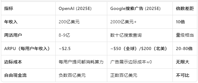 如果再上升到生意模式,就会发现纯大模型公司几乎是绝望的。谷歌的广告业务,一年2000亿美元以上营收,而且边际成本几乎为零,规模效应提供了极为正面的现金流。OpenAI虽然年化营收200亿美元,但用户越多需要的算力越多,自由现金流负得越来越多,需要巨额融资。根本区别是,大模型服务与互联网广告的规模效应完全相反。