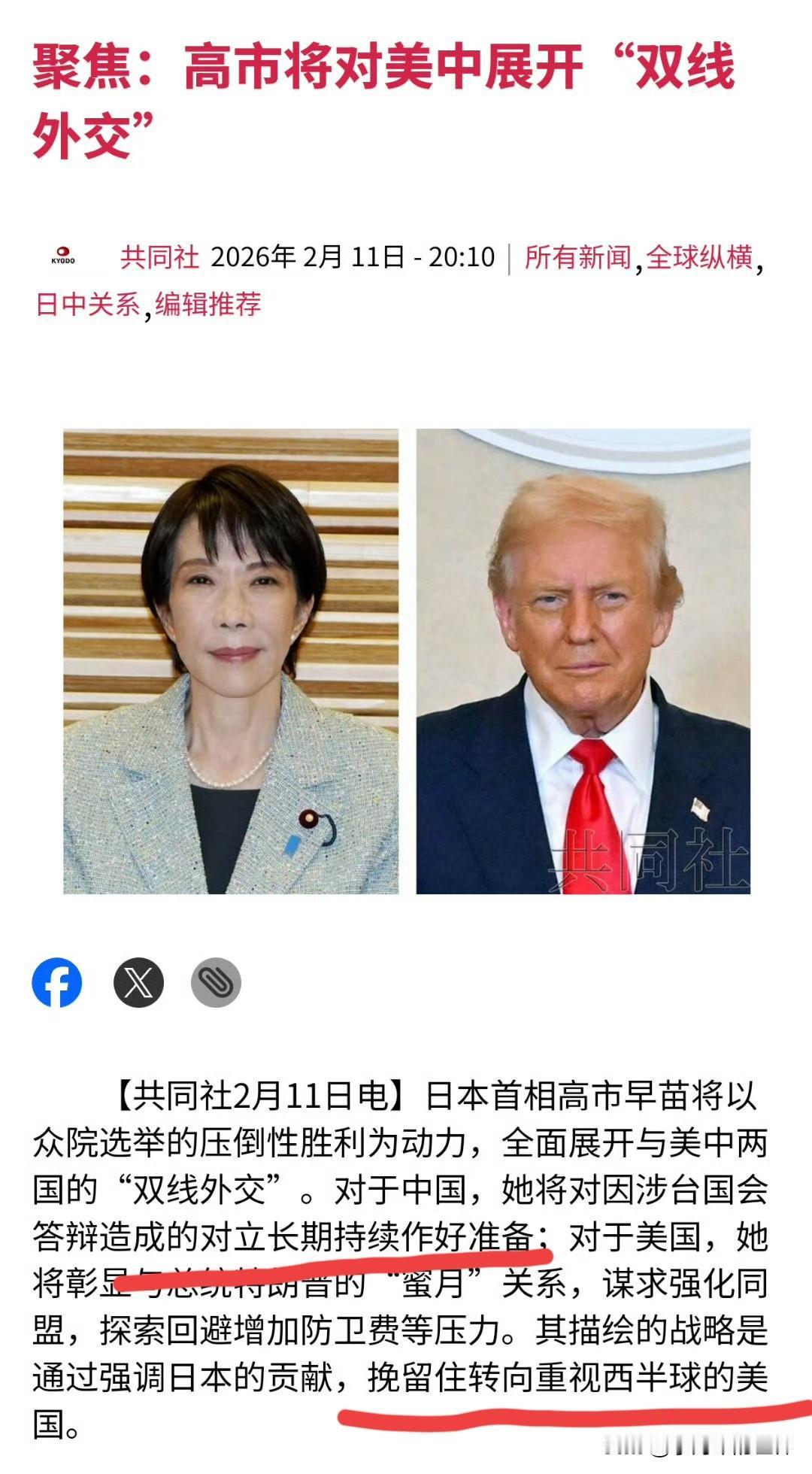 共同社:高市早苗将对中日对立长期持续做好准备。 送她两个字,乐见。 希望她说到做到,而不是光会耍嘴。 还什么“长期持续做好准备” 多长,算长期? 期待与美国的“蜜月”关系,强调日本的贡献,以期挽留美国留下。 有一说一,日本想靠“双线外交”左右逢源,本身没错。错就错在她高估了自己,忘了自己早已被美国深度绑定,也忘了自己是没有独立自主的外交(与美国),所以这注定会是一场没有结果的结局。