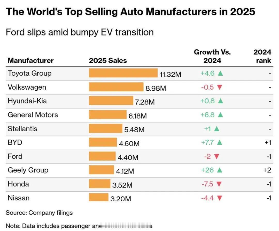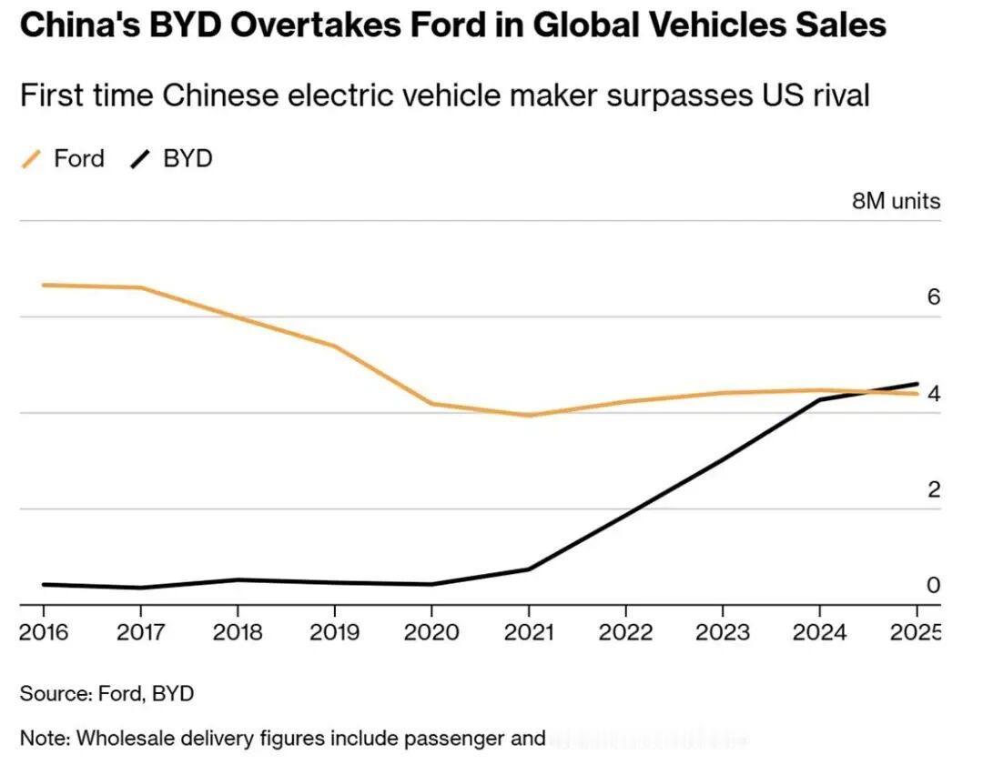 去年,福特汽车的全球销量首次被比亚迪超越,批发销量下降近2%,降至略低于440万辆,低于比亚迪今年1月公布的460万辆销量。福特周二公布的这一数据确认,比亚迪已升至全球销量排名第六位,领先福特一位。尽管福特去年在美国本土销量有所增长,但在欧洲和中国市场份额下滑明显。2025年,丰田的全球销量已连续第六年排名全球第一,全年共售出1130万辆,同比增长4.6%。 图片来源于网络