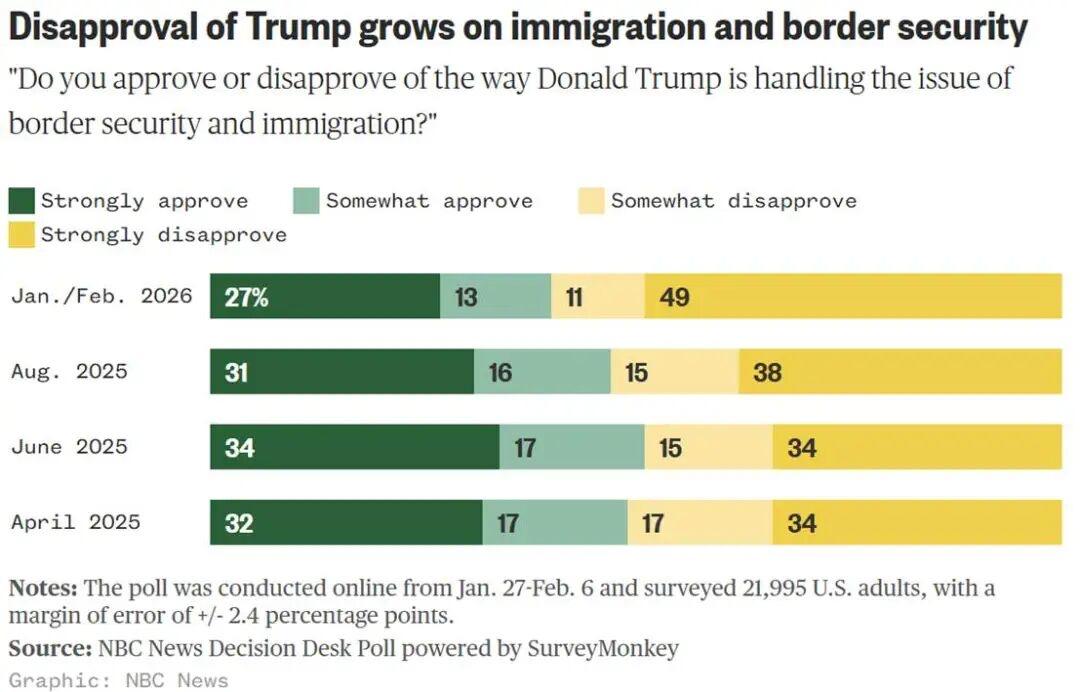 特朗普政府在多次试图向民主党执政州增派兵力遭遇司法阻力后,已从相关城市撤出所有联邦管控的国民警卫队部队。此次撤军于上月完成,除了特朗普几周前曾在社交媒体上预告撤军事宜之外,白宫和五角大楼并未公开宣布。这是一项重大转变,因为此前特朗普和赫格塞思一直坚持称,为了应对他们所称的失控暴力形势,并支持移民法的执法工作,有必要动员国民警卫队。白宫周三针对相关提问表示,特朗普去年12月曾在Truth Social上发帖称,国民警卫队将从相关城市撤离,但“当犯罪再次开始飙升时”,他将再次派遣国民警卫队进入各城市,而且“或许将以一种截然不同、更加有力的形式”派兵,“这只是时间问题”。目前仍有2500多名国民警卫队成员驻扎在华盛顿特区,响应特朗普下达的部署命令,但其指挥权并非由联邦掌控。其任务包括打击犯罪、卫生环境整治等,预计将持续至今年年底。此外,孟菲斯和新奥尔良也仍有国民警卫队驻扎。不过,这些任务虽依据与特朗普政府达成的一项新型协议由联邦政府提供经费,但指挥权仍在各州州长手中。 据美国全国广播公司(NBC)进行的最新民调显示,在联邦移民执法人员上个月开枪打死两名美国人之后,2026年初美国公众对特朗普移民议程的支持率正在急剧下滑,特朗普政府采取的激进策略和驱逐目标已经拉低了美国人对特朗普在这一曾帮助他赢得选举的关键议题上的评价,使这项原有的优势议题与其整体工作的支持率相当。目前,有49%的美国成年人强烈不赞成特朗普在边境安全和移民问题上的做法,高于去年夏天的38%和去年4月的34%。 图片来源于网络
