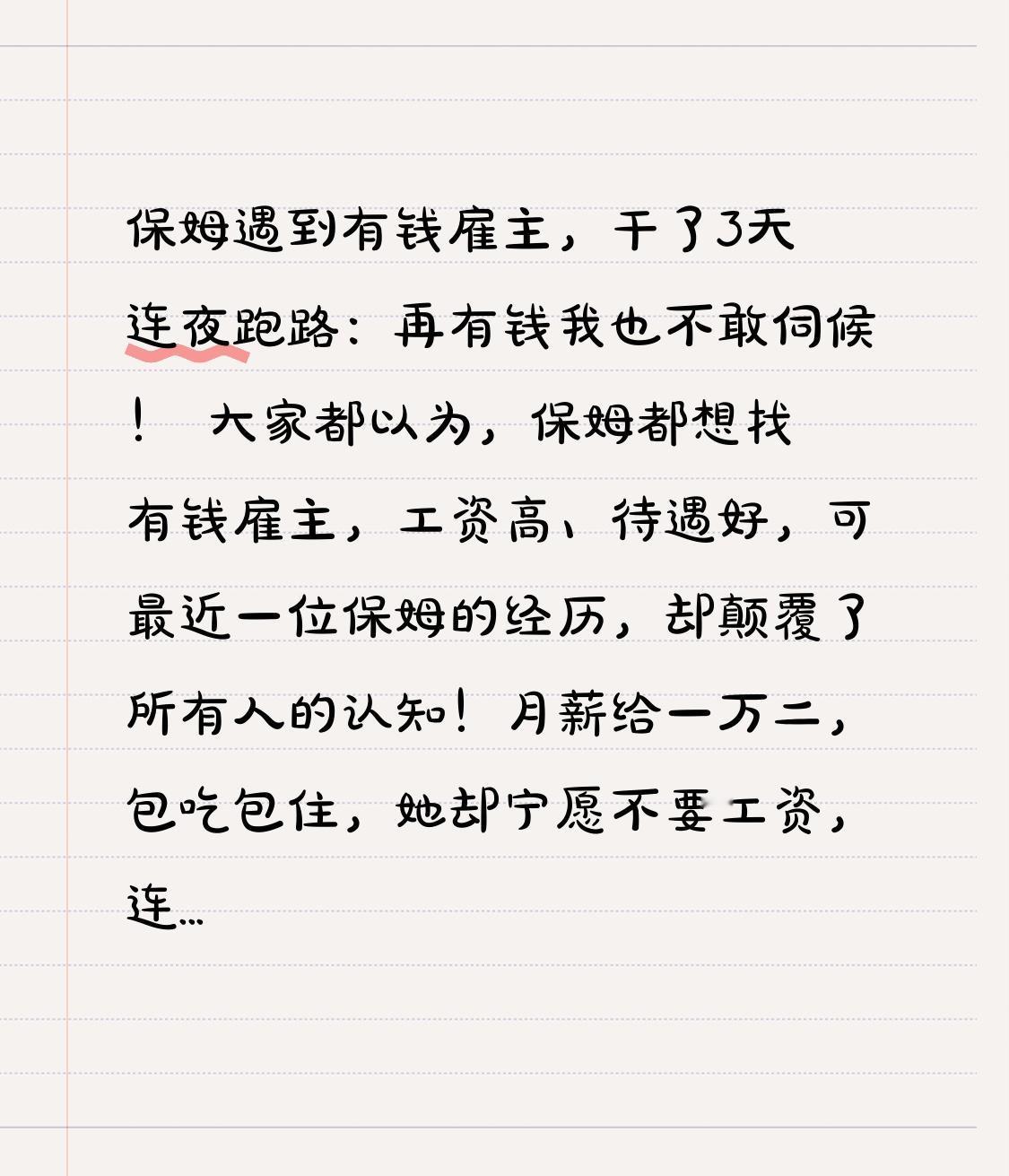 保姆遇到有钱雇主,干了3天连夜跑路:再有钱我也不敢伺候! 大家都以为,保姆都想找有钱雇主,工资高、待遇好,可最近一位保姆的经历,却颠覆了所有人的认知!月薪给一万二,包吃包住,她却宁愿不要工资,连夜收拾行李下户逃跑,到底发生了什么? 这位保姆阿姨,从业五年,一直口碑很好,这次经人介绍,去了一户家境非常优渥的家庭照顾老人,一听说月薪一万二,阿姨满心欢喜地上户了。可没想到,刚干了三天,她就吓得魂都没了,坚决要走,雇主挽留、加工资都没用。 本以为是享福,结果却是煎熬,事情的转折,就藏在有钱人家庭让人窒息的规矩里。雇主家要求极其苛刻:擦桌子要擦七遍,抹布必须分八种,擦地板不能留一根头发,做饭必须精确到克,盐放多一粒都要重做;老人稍微咳嗽一声,就质问她没照顾好;全天24小时不能休息,就连吃饭都必须站在角落,不能上桌。 更让阿姨崩溃的是,雇主全程用审视的眼光盯着她,手机随时查监控,说话句句带着轻视和不信任,完全不把她当人看,只是当成一个干活的工具。三天时间,阿姨精神高度紧张,整夜睡不着,生怕哪里做错被骂,最后实在扛不住,宁可放弃高薪,也要赶紧逃离。 这件事一出来,无数保姆、家政阿姨纷纷共鸣。大家都说:找雇主,不怕穷,就怕心穷;不怕累,就怕不被尊重。有钱不代表可以随意践踏别人的尊严,干活不代表低人一等。 其实不管是保姆、护工,还是外卖员、清洁工,每一份靠双手吃饭的工作都值得被尊重。高薪买不来真心,苛刻换不来长久,人与人之间最舒服的关系,永远是平等、理解和包容。 也提醒所有找家政的雇主:你对别人多一份体谅,别人才会对你多一份用心。看不起劳动者的人,再有钱,格局也小了。 如果你也支持尊重劳动者,点赞转发,让更多人明白:职业不分高低,人格不分贵贱!