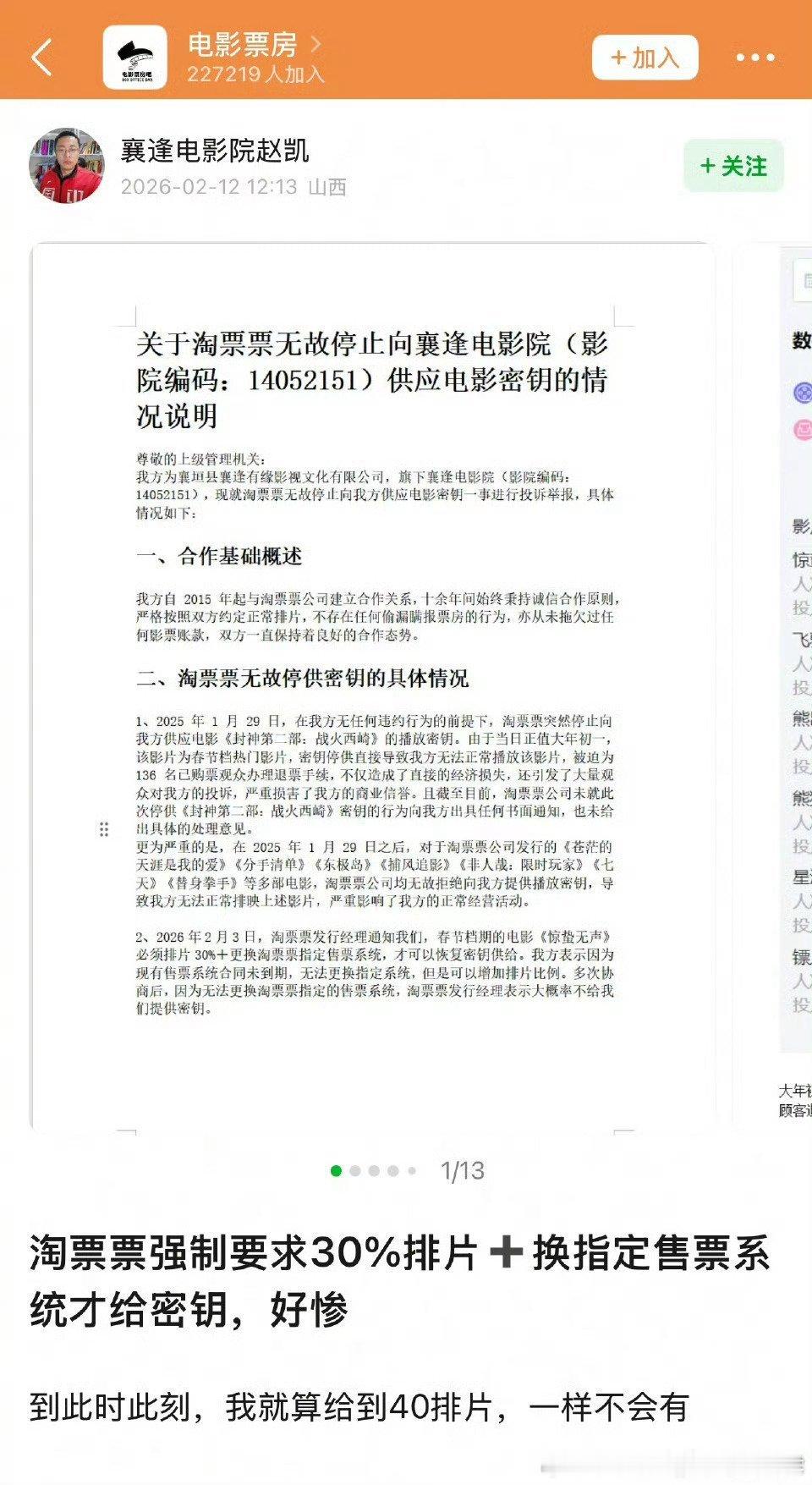 2. 今年春节档更离谱:要想拿到《惊蛰无声》的密钥,必须满足两个条件——排片30%+更换淘票票指定售票系统,哪怕影院主动把排片提到40%也被拒绝。