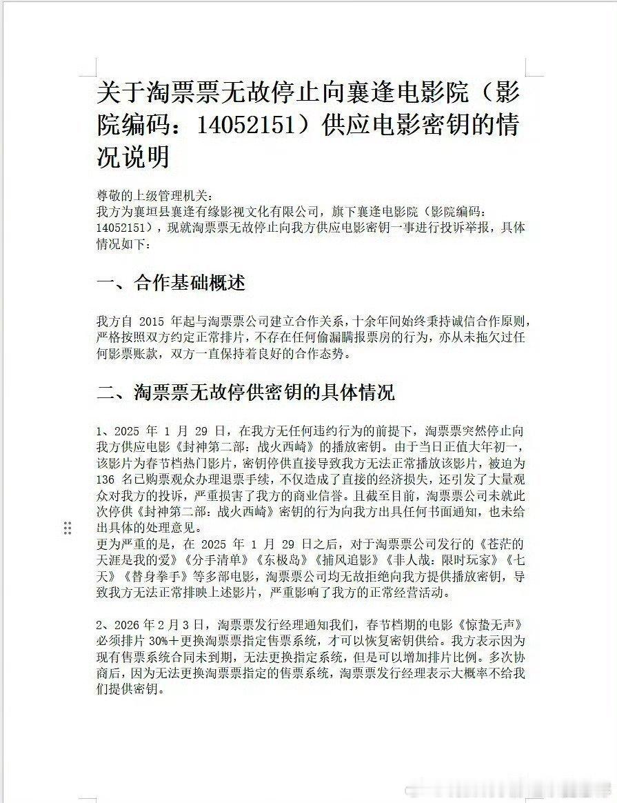 县城影院被淘票票逼到退票?😡山西襄逢电影院爆料:1. 2025年大年初一,淘票票突然停供《封神第二部》密钥,导致136名观众退票,去年初一就因这事退过票。