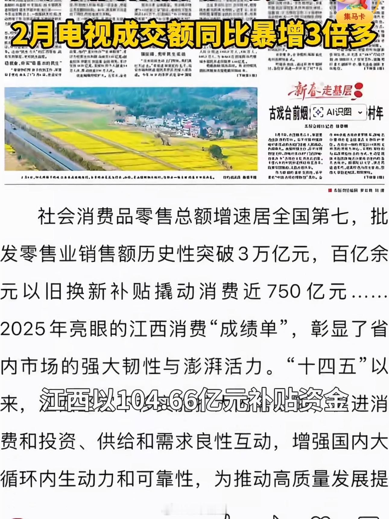 江西省2月电视成交额同比暴增353%很怀念小时候一家人围在一起看春晚的时候,现在兄弟姐妹都已经成家了,再想团聚都很难有小时候的快乐。江西30万人县城新年国补消费近2亿