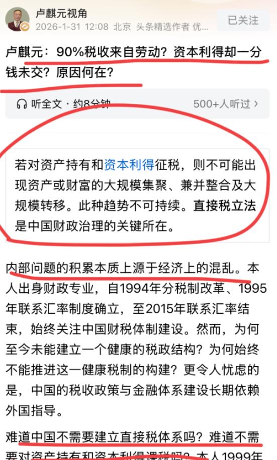 著名经济学家卢麒元先生再次发文,谈到了一个核心话题,直接税!!他认为,我们现在的税,90%的来自劳动,而资本得利,一分一毫未交,这是为何??卢总都表示不理解! 就说,普通人上班领工资,每一分钱都要扣个税,出门消费、买菜吃饭,藏在价格里的增值税一分不少;摆个小摊、开个小店,辛辛苦苦赚点血汗钱,也得按规矩缴税,半点含糊不得。 可反观那些手握亿万资产的资本大佬,日子过得有多潇洒?靠炒股票、炒房产、搞股权交易,动辄赚几百万、几千万甚至上亿,却能靠着各种手段,把该交的税全规避掉,一分钱都不用给国家交。合着缴税是普通人的义务,资本大佬就可以例外?这双标,离谱到骨子里。 很多人没看透,这根本不是简单的 “谁该缴税” 的问题,而是藏在背后的畸形格局 — 劳动越辛苦,缴税越多;资本越躺赚,缴税越少,甚至不缴。卢麒元撕开的,就是这层最隐蔽的遮羞布。 咱们当下的税制,说白了就是 “重劳动、轻资本”。 间接税占比太高,不管是普通人上班赚钱,还是小老板开厂做生意,只要有交易、有收入,就离不开缴税;可资本利得这块,却长期处于监管盲区,没有专门的直接税来约束。 就拿房地产来说,多少人靠炒房发家,一套房子涨价几百万、上千万,赚的都是纯利润,可这笔巨额收益,却不用交一分钱资本利得税;再看股市,有些资本大佬靠着内幕消息、资本运作,短时间内赚得盆满钵满,套现离场后,也能轻松规避税负,留下一堆跟风入场的散户被套牢。 还有那些所谓的 “避税操作”,说穿了就是资本大佬的特权。找个离岸小岛注册公司,搞个多层信托架构,把资产藏在海外,就能轻松避开国内的税收监管;还有些跨国资本,在国内赚得盆满钵满,却通过关联交易,把利润转移到海外低税率地区,让国内公司账面常年亏损,一分钱税都不用交。 这种离谱的现状,正在一点点拖垮实体经济,也在加剧贫富差距。普通人辛辛苦苦上班,赚的钱一部分要缴税,养家糊口都紧巴巴,消费能力越来越弱;而资本大佬不用缴税,巨额财富越积越多,还能靠着资本优势,进一步收割普通人的财富,形成 “富者愈富、贫者愈贫” 的恶性循环。 有人可能会说,资本赚钱也不容易,可再不容易,也不该比普通劳动者更 “特殊” 吧?普通人靠汗水换钱,一分不少缴税;资本靠运作赚钱,凭什么一分不缴?这不是公平与否的问题,这是根本不合理。 卢麒元反复发声,不是没事找事,更不是故意挑事,而是他看透了这种失衡的危害。这种 “劳动缴税、资本避税” 的格局,长期下去,只会让越来越多的人不愿意踏实劳动,反而想着投机取巧、跟风炒房炒股;只会让实体经济越来越难,越来越多的企业不愿意深耕实业,反而想着靠资本套利赚快钱。 其实,我们不是要 “劫富济贫”,更不是要打压资本,而是要追求公平 — 资本可以赚钱,也可以赚大钱,但必须和普通人一样,依法缴税,承担起自己的社会责任;劳动者缴税是义务,但也不该一个人扛下九成的税负,被压得喘不过气。 为什么不尽快推行直接税,堵住这些漏洞?不是不想推,而是推行起来难度极大。资本大佬手握资源、人脉,有足够的能力钻规则的空子,甚至影响规则的制定;而普通劳动者,只能被动接受既定的税制,默默承担起沉重的税负。 但值得欣慰的是,现在情况正在慢慢改变。“金税四期” 全面落地,实现了 “以数治税”,不管是个人收入,还是企业资金流向,都能被精准监管,那些隐蔽的避税操作,正在被一点点穿透;CRS 全球税务信息交换机制不断完善,海外避税的路子,也越来越窄。 卢麒元的发文,本质上就是在呼吁:加快直接税改革,让资本大佬也依法缴税,让税负变得公平合理,不要再让普通劳动者一个人负重前行。 要知道,税收从来都不是某一个群体的义务,而是全社会的责任。一个健康的社会,不该是普通人辛苦缴税、资本大佬逍遥避税;不该是劳动越辛苦,负担越重;资本越躺赚,特权越多。 九成税收压在劳动者肩头,资本却一分未缴,这种离谱的现状,该结束了。直接税改革,从来都不是一句空话,它关系到每一个普通人的切身利益,关系到实体经济的未来,更关系到整个社会的公平公正。 我们不反对资本赚钱,反对的是资本赚钱后不承担责任、不依法缴税;我们不抱怨缴税,抱怨的是税负不公,抱怨的是自己扛下了本不该独自承担的重量。