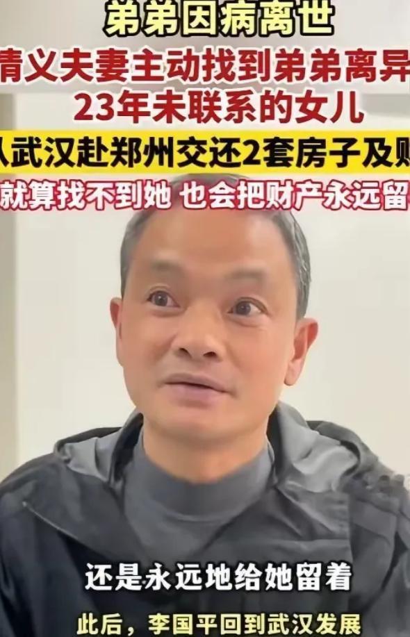 “这样的人品全国罕见!”3月29日,男子离异后1岁女儿判给前妻,从此再无交集!不料,23年后男子去世,哥哥竟不顾反对“千里”寻亲,主动将弟弟的2套房和存款转到素未谋面的侄女名下! 49 岁的李国平突发心梗去世,一辈子没再结婚,却给这个素未谋面的女儿,留下了两份房产和一笔存款。而帮他完成这份心愿的,是他的亲哥李建平,一个顶着所有反对声音,跨越千里,把弟弟的全部遗产,亲手交给一个从未见过的侄女的普通人。 料理弟弟后事时,李建平翻遍了李国平的出租屋,屋里陈设简单得不能再简单,旧家具、旧衣物,没什么值钱玩意儿。就在大家以为李国平身后只剩清贫时,李建平在一个旧抽屉的角落,摸到了一张皱巴巴的便签纸。纸都发黄卷边了,上面的字歪歪扭扭,看得出来写的时候,字迹都在抖,就一句话,却让李建平当场红了眼,也让他下了一个谁劝都不听的决定。 “我欠她的,走后所有东西,都给她。” 这 “她”,就是李国平那个 1 岁就分离的女儿。没人知道,这 23 年里,李国平过得有多煎熬。离异后不敢找女儿,不是不爱,是怕自己的出现打扰到孩子的生活,怕自己给不了孩子完整的家,更怕自己的窘迫,让孩子抬不起头。 他默默打拼,省吃俭用,舍不得买新衣服,舍不得吃顿好的,硬生生攒下两套房子和一笔存款,从来不是为了自己,而是想给这个没陪过一天的女儿,留一条后路,补一份亏欠。 这份藏在沉默里的父爱,李建平最懂。弟弟性格内向,有话从不直说,可这份牵挂,却藏了整整 23 年,直到临终,都没能放下。李建平拿着便签纸,一夜没合眼,他心里只有一个念头:无论多难,都要找到侄女,把弟弟的东西,一分不少地交给她,完成弟弟最后的心愿。 可当李建平把这个想法说出来时,身边的人都炸了,劝阻的声音一波接一波。亲戚说:“23 年没联系,早就不是一家人了,你这是瞎忙活,纯属傻气!” 朋友劝:“两套房子加存款,可不是小数目,你弟弟没结婚,你作为亲哥,继承天经地义,犯不着白白送给一个陌生人。” 还有人冷嘲热讽:“现在谁不图钱?你这么做,要么是装好人,要么就是脑子不清醒,这样的人品,全国都找不出几个。” 面对所有人的不解和反对,李建平没有丝毫动摇,也没有过多辩解,只说了一句实在话:“钱没了可以再赚,良心没了,这辈子都安不了心。我弟弟欠孩子的,我不能再让他带着遗憾走,我做的,只是我该做的事。” 这话没有华丽的辞藻,却字字戳心。当下这个年代,太多人为了钱,争得面红耳赤,亲兄弟反目成仇,亲人之间撕破脸皮,把亲情看得一文不值。为了一套房子,对簿公堂;为了一笔存款,诋毁谩骂,这样的事情,我们见得太多太多。 可李建平,却反其道而行之,放着手到擒来的财富不要,偏偏要跨越千里,去圆一个素未谋面的人的心愿,去守一份沉甸甸的道义。 说做就做,李建平放下手头的生意,关掉门店,带着妻子,踏上了千里寻亲之路。从武汉到郑州,几百公里的路程,没有确切的地址,没有准确的联系方式,只有一个模糊的名字,和一份不肯放弃的信念。他们跑遍了郑州的大街小巷,辗转各个社区、派出所,逢人就打听,哪怕一次次被拒绝,一次次失望,也从来没有想过回头。 他们一路上吃不好、睡不好,忍受着旅途的疲惫,承受着旁人的异样眼光,有人说他们傻,有人说他们不值得,可他们从来没有放在心上。在李建平看来,他寻找的不仅仅是一个侄女,更是弟弟留在世间唯一的血脉,是一份无法割舍的亲情,是一份必须守住的承诺。 功夫不负有心人,经过半个多月的辗转奔波,李建平终于找到了侄女。这个当年襁褓中的小婴儿,如今已经长成了 23 岁的姑娘,眉眼间,和李国平有几分相似。可当李建平说出自己的身份,说出事情的来龙去脉时,姑娘彻底愣住了,眼泪瞬间就流了下来。 她从来不知道,自己还有一个从未谋面的父亲;从来不知道,自己的父亲,竟然一直牵挂着她;更不知道,素未谋面的伯父,会跨越千里,只为把父亲的遗产,完完整整地交到自己手上。 更让人心疼的是,姑娘的母亲,几年前就因病去世了,她从小就寄人篱下,吃苦受累,一路走来,满是艰辛,却从来没有抱怨过一句。 李建平当着姑娘的面,拿出了所有的证明材料,亲手把两套房产的过户手续办好,把弟弟省吃俭用留下的存款,一分不少地转到了她的名下。 他摸着姑娘的头,轻声说:“孩子,委屈你了,你爸爸这辈子都在愧疚,没能陪你长大,这是他一辈子的心血,也是他对你唯一的补偿,以后,好好过日子,别辜负你爸爸的心意。” 姑娘握着那张皱巴巴的便签纸,看着眼前这位善良的伯父,哽咽着说不出话来。她知道,这份遗产,从来都不只是房子和钱,是父亲藏了 23 年的父爱,是伯父义无反顾的坚守,更是一份跨越了时光的温暖与道义。