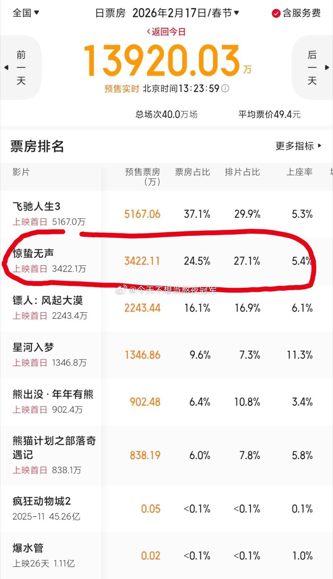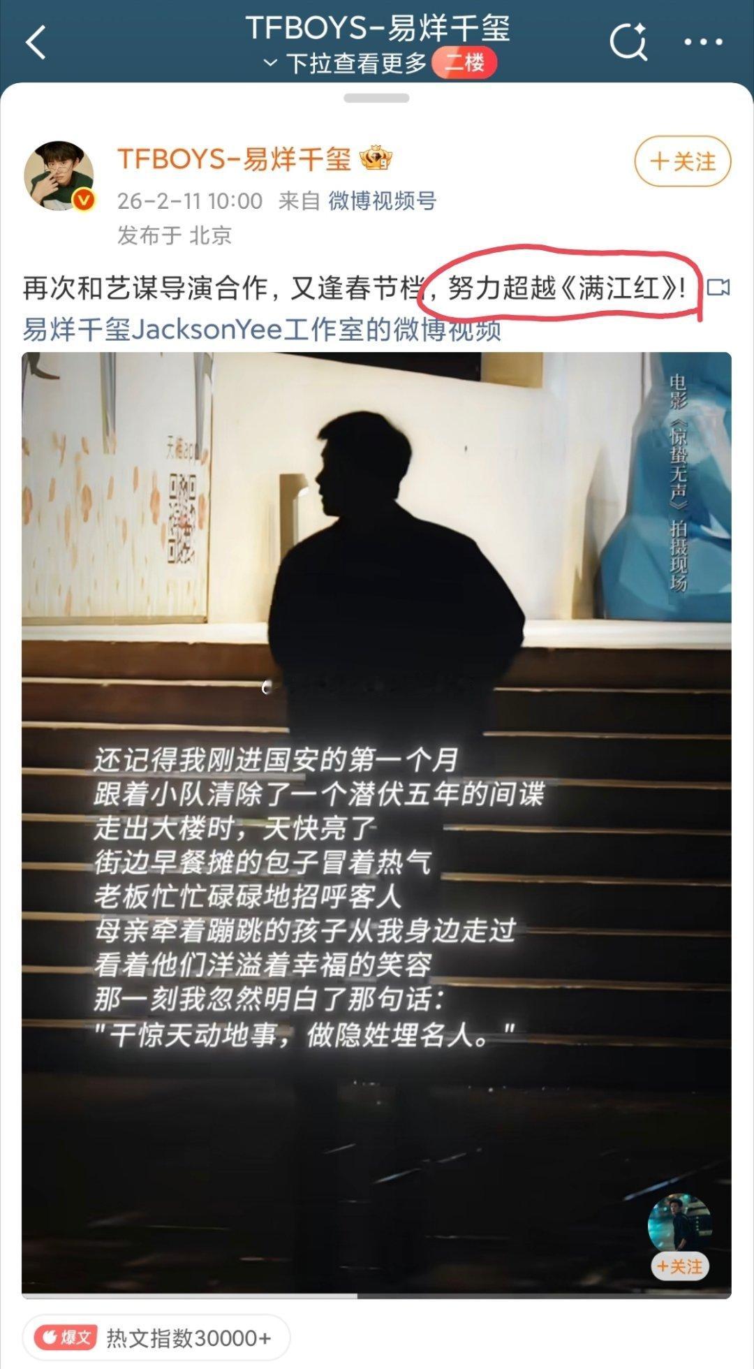 易烊千玺说再次和emo合作《惊蛰无声》,会努力超越《满江红》。要知道《满江红》票房45亿,首日预售就破2亿,还有沈腾、张译这两个扛票房的在。而《惊蛰无声》预售三天了才3kw,占比已经倒挂,而且这种题材放春节档本来就不占优势。。。不知道这个是四字本人的意思,还是团队/片方的要求?总之这个flag立得有点大了,按照目前的走势,完全压力山大。。。易烊千玺 努力超越满江红惊蛰无声
