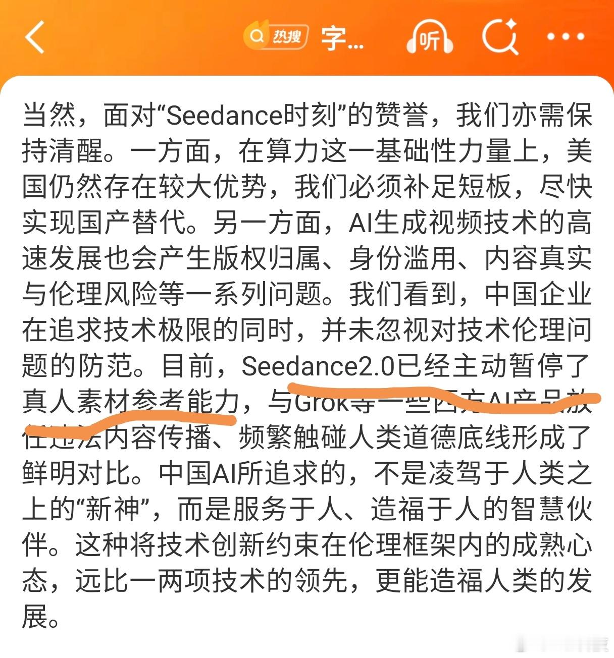 AI想要迸发生产力,我个人认为是应该尽量开放真人素材参考能力,只是要加强下管控即可,比如用真人生产视频素材可以先人脸识别认证授权一下……从Deepseek到Seedance中国AI成了
