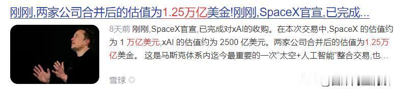 马斯克这次要玩把大的。 他想把他旗下的X-AI、SPACE-X和TESLA整合在一起,形成一个全球有史以来最强大的金融帝国。 你没有看错,完全不是什么科技帝国,就是金融帝国。 这才是他的底色,虽然SPACE-X一年才营收150亿美元,也才赚80亿美元,但不妨碍它被估值1万亿美元。 X-AI一年营收5亿美元亏损130亿美元,但不妨碍它被估值2500亿美元。 特斯拉一年营收950亿美元,赚38亿美元。 马斯克旗下三大公司,两家赚钱的不够一家亏的。 然而这并不妨碍他坐上全球首富的位置。 这才是他的底色。 所以我们才会看到他的永远在明年的火星计划,现在规划的10年后月球城市计划,星链,顺便说一句,被吹爆的星链现在全球只有几百万用户。 只要他敢吹,有人敢信,那么钱就来了。 所以马斯克不是什么伟大的科技创造者,他是一个极其卓越的资本家。 对比一下中国企业的估值,对比一下中国航天踏实的做事。 就知道美国人真的是激素肉吃太多了。 点右上角关注我,我们一起去看这个魔幻的世界