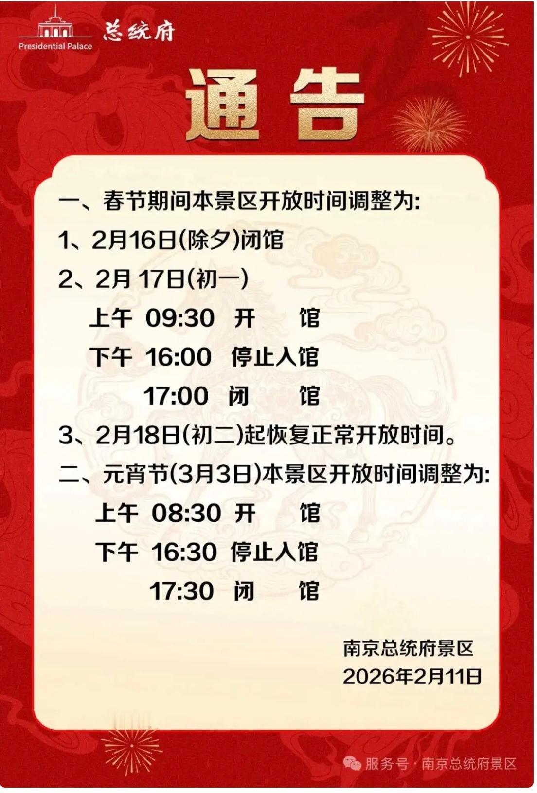 根据南京总统府景区最新通告,春节和元宵节期间,景区将调整开放时间。具体安排如下: 春节期间:景区将根据节日安排,延长或调整开放时间 元宵节期间(2月到3月期间的具体日期):景区将按照节日特色,实行特殊开放时间或有限制措施。 建议游客在计划前往前,关注南京总统府景区的官方网站或官方微信公众号,以获取最新的开放时间和相关通知,确保行程顺利。南京旅游 南京旅游攻略