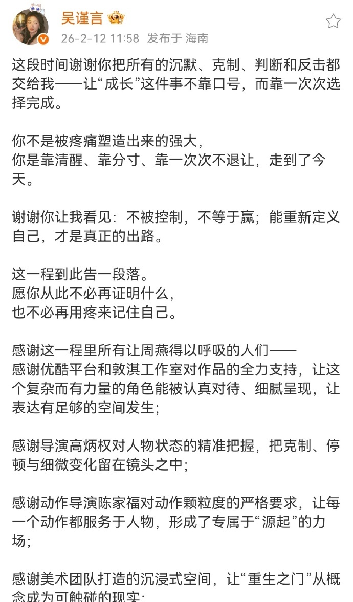 吴谨言杀青长文 吴谨言又一部剧《重生之门》杀青了!看到这一次的杀青长文的时候,真的是觉得特别的动容!对于角色也是付出了很多 吴谨言又一部剧杀青