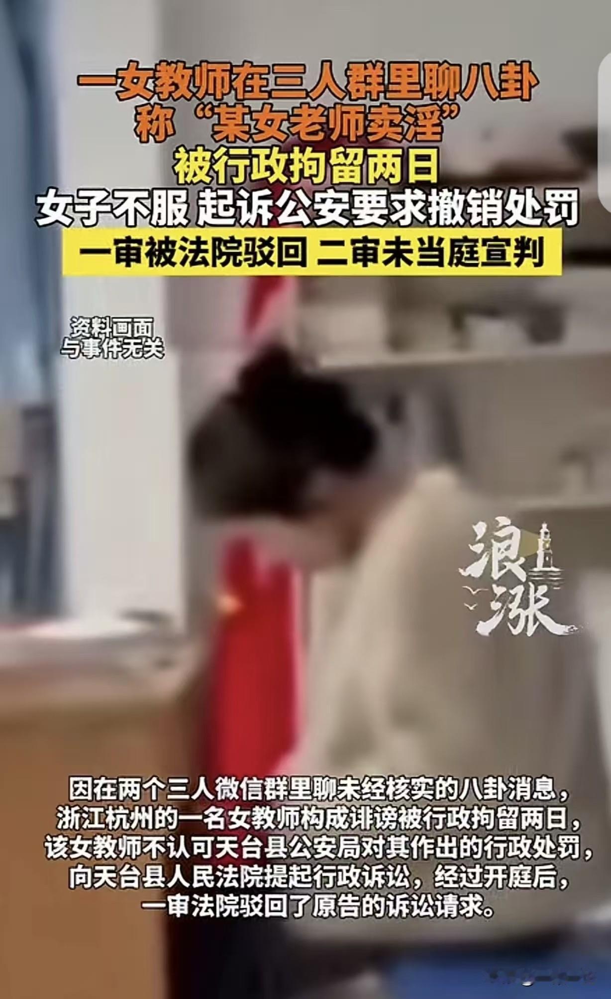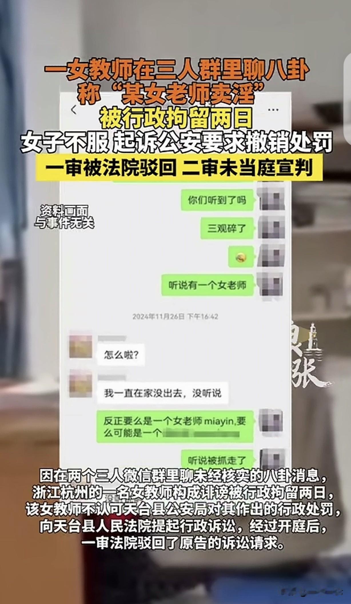 “这就是长舌的代价!”浙江杭州,一女老师在3人群里聊八卦,传某女老师maiyin的谣言,被另外2个人给背刺了,她被拘留2日,女子不服,起诉到法院要求撤销处罚,一审把她驳回了,她继续不服提起上诉。网友:谣言是刀,诸位是屠夫,切记,3人不谈私事,5人不谈公事。 一位姓林的女老师,因为管不住自己的嘴,在3人微信群里聊八卦,结果惹出了大麻烦。 那天,林某在微信群里兴致勃勃地开启话题:“我听说某中的一个八卦,你们听说了吗,三观碎了,听说有个女老师……” 这话一抛出,群里另一个女子瞬间来了兴趣,连忙追问:“怎么了?我一直在家没出去,快说说。” 林某见有人搭话,更加来劲,神秘兮兮地说:“听说一个女老师maiyin,被抓走了,拘留了。” 这消息一传开,群里气氛瞬间热烈起来,大家你一言我一语地讨论着。 林某不仅在闺蜜群里聊得火热,还在和父母组成的3人家庭群里再次提及此事,甚至提供了被传谣女老师的姓名和照片。她本以为这只是小范围的闲聊,不会有什么严重后果。 可她万万没想到,这看似不起眼的八卦,就像一颗投入平静湖面的石子,激起了层层涟漪。 群里另外两个人,不知是有意还是无意,将这消息传播了出去,导致不实信息迅速扩散,对被传谣女老师的名誉造成了极大的损害。 很快,事情闹大了。被传谣的女老师不堪其扰,选择了报警。 警方介入调查后,发现林某在没核实信息真实性的情况下,就随意传播不实消息,已经构成了诽谤。 而且,由于信息扩散范围较广,给受害者的正常工作、生活、身心健康都带来了较大影响,情节较为严重。 最终,警方依据《治安管理处罚法》,对林某作出了行政拘留2日的处罚。 林某这下傻眼了,她觉得自己太冤了,不就是闲聊几句八卦嘛,怎么就被拘留了呢? 她不服这个处罚决定,一纸诉状告上了法院,要求撤销处罚。 一审法院经过审理,认为警方的行政处罚事实清楚、程序合法,驳回了她的诉讼请求。 林某依旧不服,又提起了上诉。可法律是公正的,不会因为她的主观感受而改变。 网络时代,信息传播迅速,我们说话做事一定要谨慎,不能随意传播未经证实的消息。 就像网友说的:“谣言是刀,诸位是屠夫,切记,3人不谈私事,5人不谈公事。” 否则,就可能像林某一样,为自己的长舌付出沉重的代价。 有人说,这种长舌最招人烦,即使别人的隐私,也不应该轮到你说三道四吧!拘留太便宜她了,还好意思起诉?这回好了,行政拘留了,教师生涯是废了!没有哪个学校要有拘留案底的老师的! 病从口入,祸从口出!三个人的群,那谁给他泄露的信息?老话说:人三处惹祸,嘴、手、下半身! 林某在三人微信群里传播某女老师的谣言,最终被行政拘留,还闹上法庭,这看似是八卦惹的祸,实则是她缺乏对法律和他人权益的敬畏。 在信息飞速传播的网络时代,八卦就像病毒,一旦释放就可能迅速扩散,造成难以挽回的后果。 林某随意传播未经证实的消息,不仅伤害了被传谣女老师的名誉,也破坏了社会的公序良俗。 她以为八卦几句没事,却没意识到自己的行为已经触犯了法律红线。 那些指责林某“拘留太便宜她”的声音,虽有些过激,但也反映出大众对谣言的痛恨。 谣言不仅会伤害个人,还可能引发恐慌,扰乱正常秩序。而林某不仅不反思自己的错误,还起诉要求撤销处罚,这更是对法律权威的挑战。 我们每个人都应该管好自己的嘴,不随意传播没经证实的信息,做到谨言慎行。 《治安管理处罚法》第42条规定,公然侮辱他人或者捏造事实诽谤他人的,处五日以下拘留或者五百元以下罚款;情节较重的,处五日以上十日以下拘留,可以并处五百元以下罚款。 林某在没核实信息真实性的情况下,传播某女老师的谣言,造成不实信息扩散,损害了他人名誉,符合该法条规定的情形,警方对其作出行政拘留2日的处罚合法合理。 对于这件事,你怎么看? 欢迎关注@一案一论