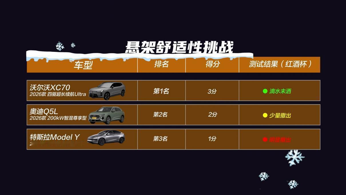 极端冬测检验高端SUV能力:全新XC70赢了奥迪、特斯拉? 近日,沃尔沃全新XC70与新一代奥迪Q5L、特斯拉Model Y一同进行了极寒极端环境下的8项测试,既涉及储物装载、座椅压力舒适、低温冷启动等动态等静态表现,也包括了自动泊车、悬架舒适等能力。 能看到的是,在所有8项挑战里,XC70都排在了前列。在极为关键的悬架舒适方面,通过全系标配40ms实现软硬极端调节的可变阻尼减振,XC70在苛刻的水杯挑战中高居第一,能在颠簸的冰雪路段滴水未洒,确实令人惊讶。 此外,XC70拥有200km+纯电续航,能在7种混动工作模式下时刻保持高效状态,这使得它在200km长测中以125.95元成本成为了最均衡的存在,既比Q5L省钱,也没有Model Y的续航焦虑。 而在低温冷启动一项中,测试前XC70舱内部分温度低至零下40°C,而通过20分钟升温(座椅加热/空调24°C)测试,只有XC70实现了全域测温均达到正数,而且比起方向盘温度依旧在零下的奥迪Q5L、Model Y,XC70已高达31.4°C。 简而言之,在咱们冬季出行中,沃尔沃XC70能通过电加热+发动机升温来快速兑现舒适体感温度,并通过主动闭合格栅等措施优化保温,让不仅有动态舒适,更做到所有细节都足够人性化,而这便是选择豪华SUV的用户,所想要收获的全方位豪华。【来自懂车帝车友圈】