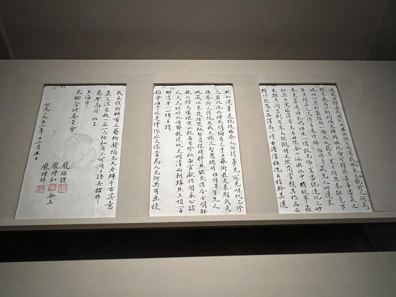 前几天看南京博物院的通报,想起看过的南宋朱克柔缂丝《莲塘乳鸭图》,这也是庞莱臣后人在1952年捐给上博的珍品。 这件伟大的作品是上海博物馆的镇馆之宝之一,2022年曾在上海博物馆70周年庆时特展过,只展出了区区两周时间。那个时候还是口罩时期,博物馆人比往常要少得多,但是这个特展依然在四楼展厅门口排起了队。考虑到文物的保护,展厅灯光很昏暗,因为这类珍贵的字画丝制品最好就是不要轻易的见光,另外绝对禁止拍照,以避免有些人忘了关闪光灯,并严格限制参观人数,每场限时20分钟。 《莲塘乳鸭图》真迹放在正厅中间,第一眼看到以为就是一幅画,描绘了夏季莲荷盛开,乳鸭戏水,燕飞塘上,白鹭相顾,蜻蜓立莲,里面的动物都是成双成对出现,也是“成双成对、多子多福”的美好祝愿。历经千年颜色虽有黯淡,但依然遮不住这件艺术瑰宝的绝世风华。而俗话说纸寿干年绢寿八百,漫长的时光中,再怎么精心保护,脆弱的丝织品都属于展一次伤一次,这也是这幅国宝被珍藏久未露面的原因,下次想再看真迹,不知道何年何月了。 而上海博物馆对捐赠者也非常尊敬,当年庞氏后人的捐赠附函也一并展出,小楷写得非常漂亮,尤其最后所书:“我民族所特有之艺术,发扬光大垂辉千古,其意义之深长,较一家一己所私有,不可同日语矣”。 庞家这等文章境界,令人敬仰, 为后世重。