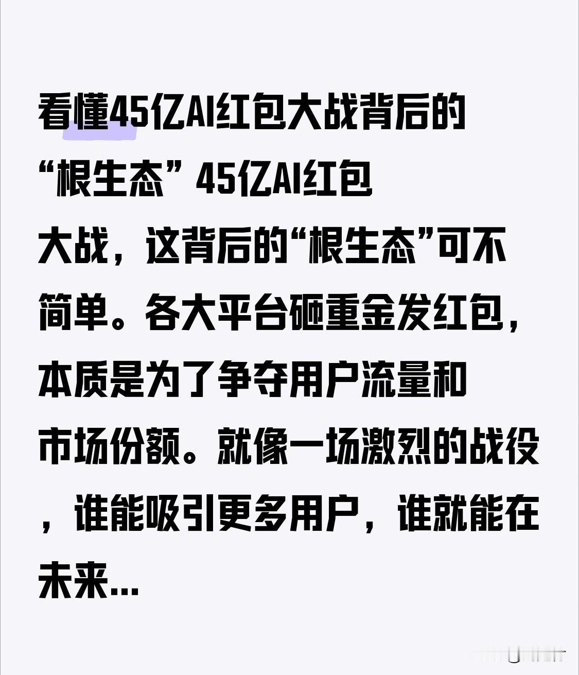 看懂45亿AI红包大战背后的“根生态” 看懂45亿AI红包大战背后的“根生态” 45亿AI红包大战背后的“根生态”并不简单。各大平台斥巨资发红包,本质上是为争夺用户流量和市场份额。这如同一场激烈的战役,谁吸引的用户多,谁就能在未来商业竞争中占据优势。 从用户角度而言,自然乐于薅这波羊毛,抢红包充满乐趣。但平台并非在做慈善,它们用红包吸引用户互动,收集数据以开展精准营销。 比如,有的平台利用AI技术,根据用户行为和偏好发放红包,提高用户参与度和粘性。这场红包大战是平台、用户和AI技术相互交织的复杂生态,值得深入琢磨。