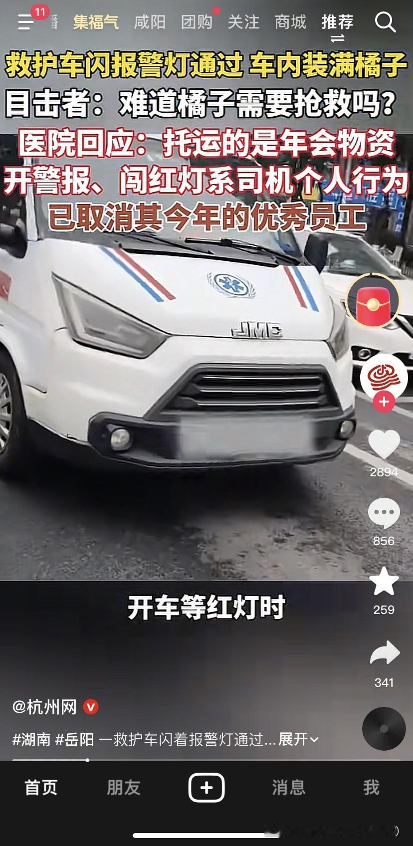 要抢救一车橘子,看来不赶时间就死了! 湖南岳阳一个救护车拉了一车橘子,还拉着警报闯红灯,感觉好像自己拉了一个急需到医院救助的人了。 以为自己开了救护车,拉警报闯红灯就没人管了。 岂不知,大家的眼睛是雪亮的,救护车闯红灯是在进行紧急救助任务时才可以拉警报、闯红灯,逆行等。 而你拉了一车橘子,还真当人都不知道了,这又不是紧急任务,不管啥车都必须按照交通规则来。 医院说这个拉警报、闯红灯是个人行为,已经取消了这个人的优秀员工。
