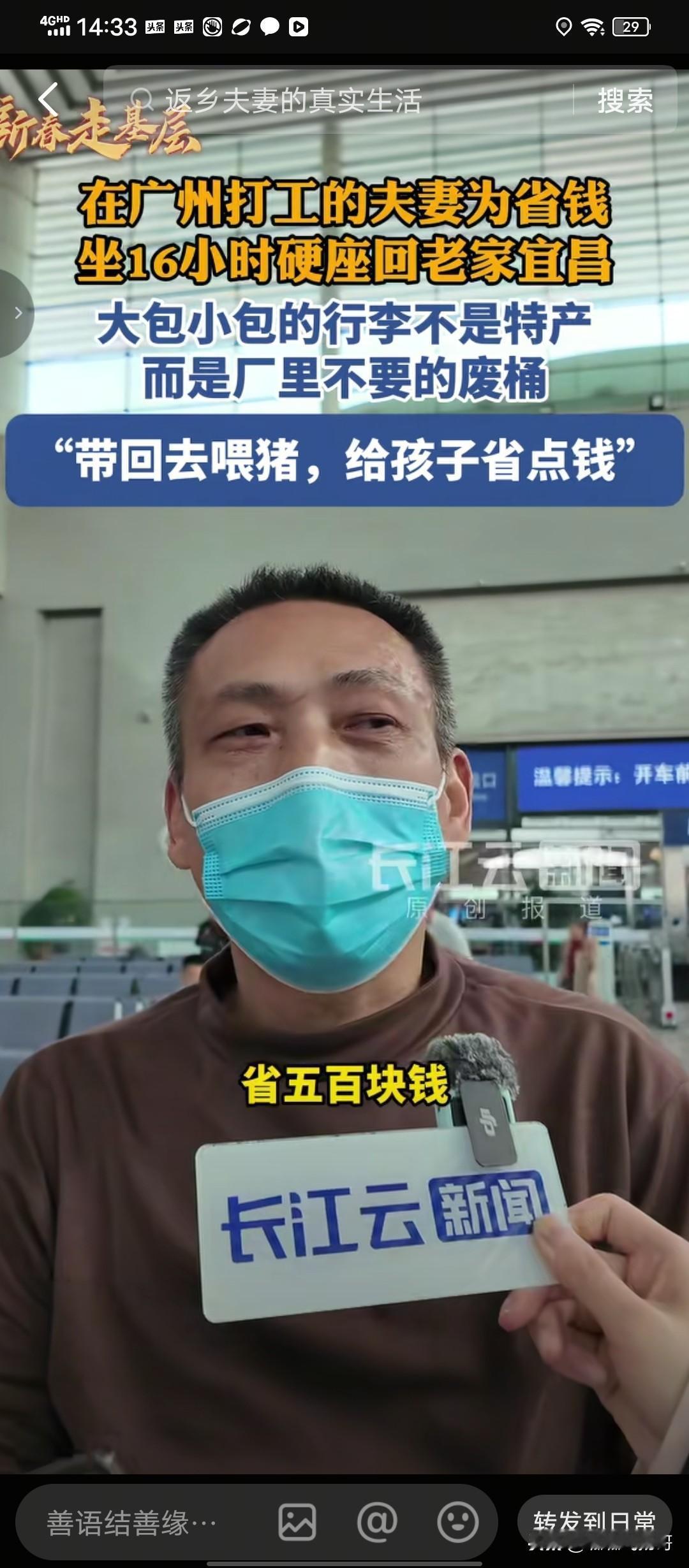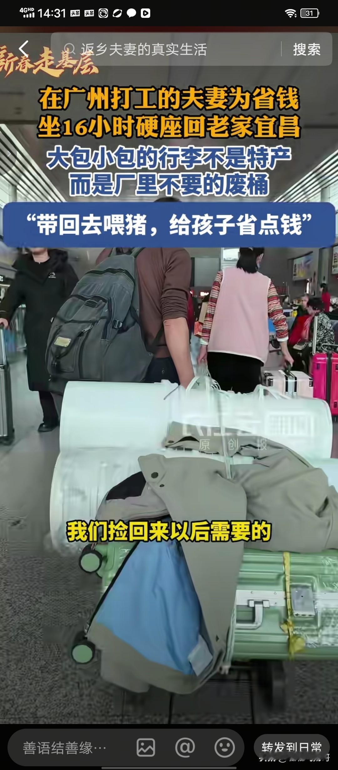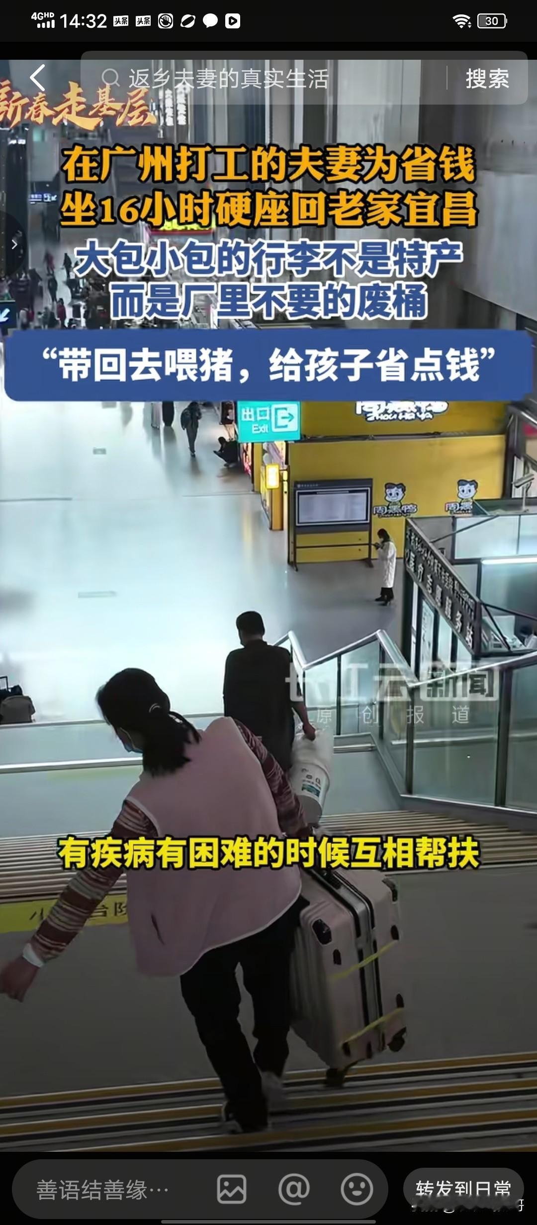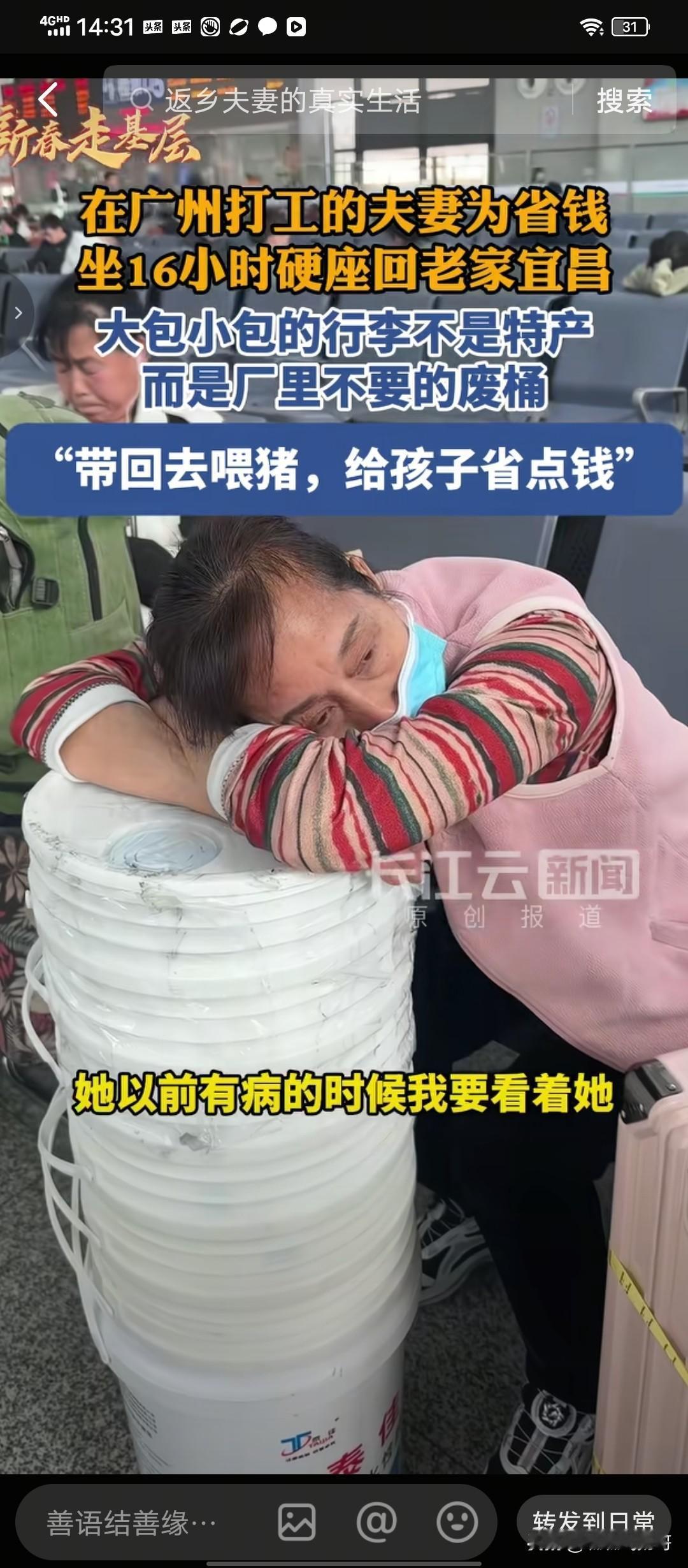 2月11号,宜昌火车站一对夫妻携带的特殊“行李”引人注意。 春节临近,火车站繁忙起来, 记者赶到火车站捕捉新闻 。 一对夫妻的特殊行李吸引了记者的注意。 这对夫妻除带了几个皮箱,一个背包外,还带了十几个白色的塑料桶 。 在记者看来,带这么多桶赶火车多么累呀。 为了方便将桶带回家,这对夫妻还专门买了一个简易手拉车, 桶放在手拉车上, 搬运起来就不显得那么累了。 记者很好奇 ,为什么要将这些白色塑料桶带回家呢? 男子说, 我们在广州打工 ,从深圳东坐绿皮火车回家过年 , 坐高铁 680,坐绿皮才200来块钱,省了五六百, 能省就省一些吧 。这些白色的桶是工厂上不要的,我们带回家给儿子养猪用 , 儿子就不用买桶了 ,这样也可以省下一些钱。 说到妻子,男子说她生病了,没工作 ,带在身边,我可以照顾她 。人生相伴 ,她有病有困难,肯定要互相相扶照顾,并不是一种拖累 。 这就是普通人的生活,一生都在努力挣钱,也在努力省钱。过得再拮据, 应该承担的责任一点也不含糊。 “她有病有困难,肯定要互相相扶帮助,并不是一种拖累 ”。 不讲大道理,只说实话,这种夫妻之间相濡以沫的高贵品质在男子这里是那么自然,比任何山盟海誓都来得真诚。 现实生活中,往往普通人恰恰有着难得的高贵品质 。 (素材来源,长江云新闻 )