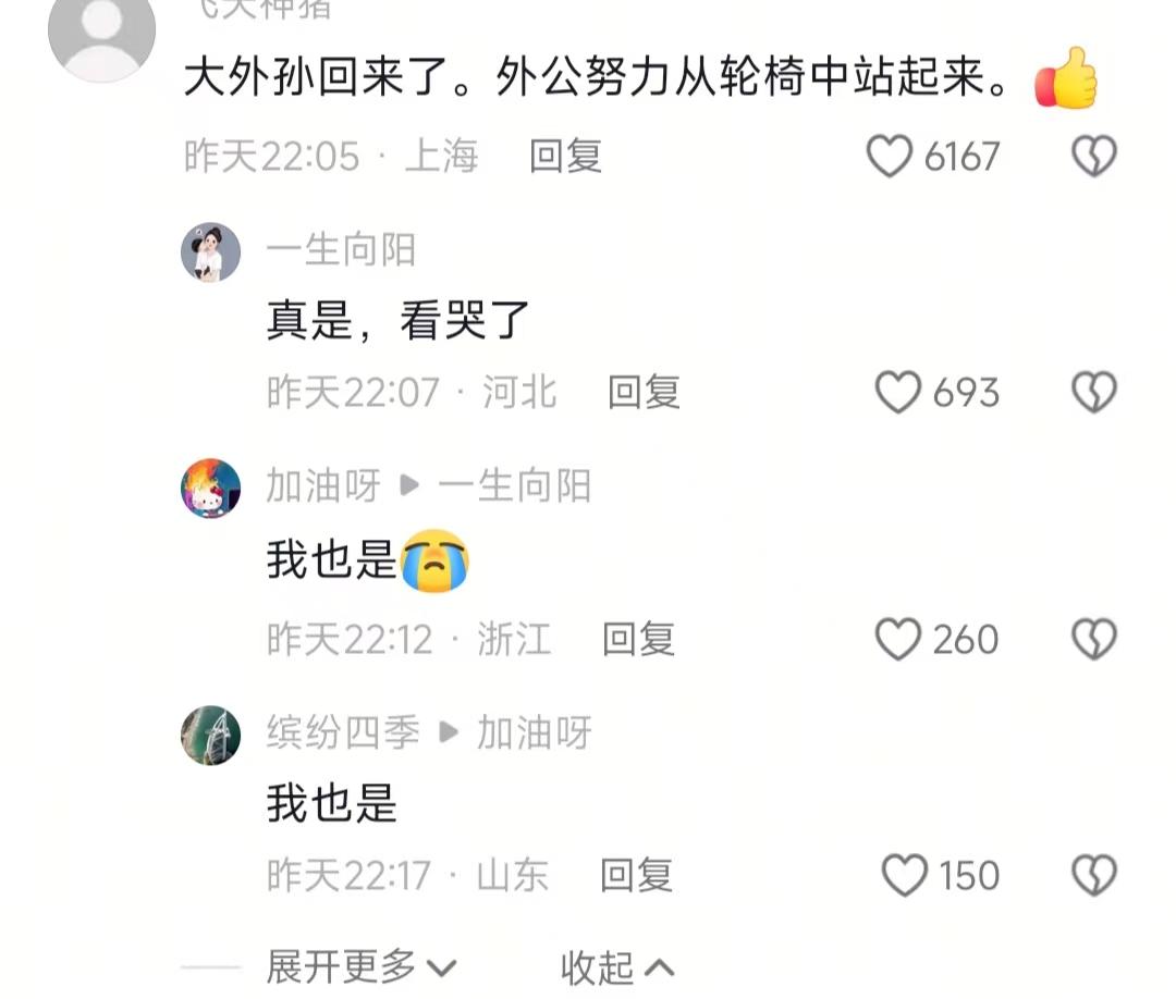 我终于知道 为什么谢浩男外公多年没见到的他,却依然可以一眼就认出来,这就是亲情 谁懂啊家人们!刷到谢妈带浩男回大山外婆家的视频,我直接绷不住了!本来以为就是普通回娘家,越看越破防,郁闷了好几天的糟心事,瞬间被冲得烟消云散。说实话,长这么大,第一次见亲情能有这么大的力量,么么三三,真的太戳心了! 谢妈带着浩男和几个孩子往大山里的外婆家赶,路上买了水果,小女儿一路蹦蹦跳跳唱歌,啥烦恼都没有,看着就舒心。本来想这就是平平无奇的归家路,可进了山看到外婆的那一刻,氛围直接变了,浩男麻溜地上去抱外婆,外婆穿着红罩衣,笑个不停,这画面,太给力了。 一家人和外婆挨个拥抱,浩男跟在身边,这是他第一次踏足妈妈长大的地方,没有虚头巴脑的套路,全是实打实的亲情。老实讲,我之前刷到过很多失散家庭,有的老人没等到孩子就走了,当时真郁闷,觉得命运太不公,可看到这一幕,突然觉得一切都还来得及。 最让我和小伙伴都惊呆了的是,瘫痪多年的外公,见到浩男居然挣扎着站了起来!不是吧?真的假的?我反复拉进度条看了三遍,谢妈赶紧扶着老爸,外公说天天在手机里看外孙,今天终于见着真人了,俩人耳朵长得一模一样,这就是血脉的力量啊。 浩男也特别懂事,吃饭前麻溜端菜,挨着外公拉家常,外公心里别提多踏实了,觉得女儿终于有了依靠。人家常说那种讲缘法的道理,欠了的亲情,兜兜转转总会圆,我以前觉得胡扯,现在真信了,这哪是奇迹,是盼了25年的念想,硬撑着老人站了起来。 这顿团圆饭,迟了整整25年,三代人围坐在一起,外公外婆能亲手抱外孙,浩男能看看妈妈的老家,太棒了!本来以为团圆就够戳心了,谢妈站在门口喊“妈,爸爸,我回来了”,我直接崩溃大哭,谁不管多大,都是爸妈眼里永远的小孩啊。 网友们也全破防了,有人刷了十遍视频,有人说外公是心愿了了才站起来,说实话,这一幕比任何偶像剧都好哭,YYDS,这才是最真实的人间温暖。 谢妈这些年真的太不容易,现在直播有了收入,能挺直腰板回娘家,能孝敬爸妈,苦尽甘来太完美了。网友们各种祝福,说她终于放下包袱,穿的衣服也大气,这就是熬出头的样子。 当然也有人揪着说是不是摆拍,可我觉得,不管咋样,这份团圆是真的,老人的开心是真的,没必要较真。 总之,我想说的是,别总纠结那些闹挺的破事,也别嫌回家麻烦,家人的念想,从来都是藏在岁月里的牵挂。有空常回家看看,比啥都强,毕竟能团圆的日子,才是最顶的幸福啊!你说是吧!