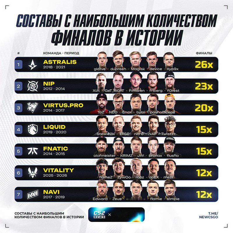 近日外媒统计了历史上各阵容闯入决赛的次数,Vitality在IEM克拉科夫圆满结