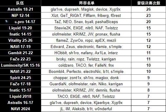 领跑榜单的是Astralis和NiP的黄金阵容,以当下环境而言几乎无法超越。纵观整个历史,仅有17套阵容能在存续期间至少打进七次顶级赛事的总决赛。