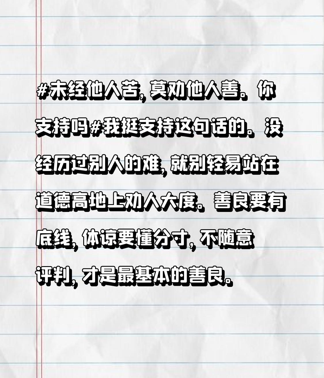 未经他人苦,莫劝他人善。你支持吗我挺支持这句话的。没经历过别人的难,就别轻易站在道德高地上劝人大度。善良要有底线,体谅要懂分寸,不随意评判,才是最基本的善良。
