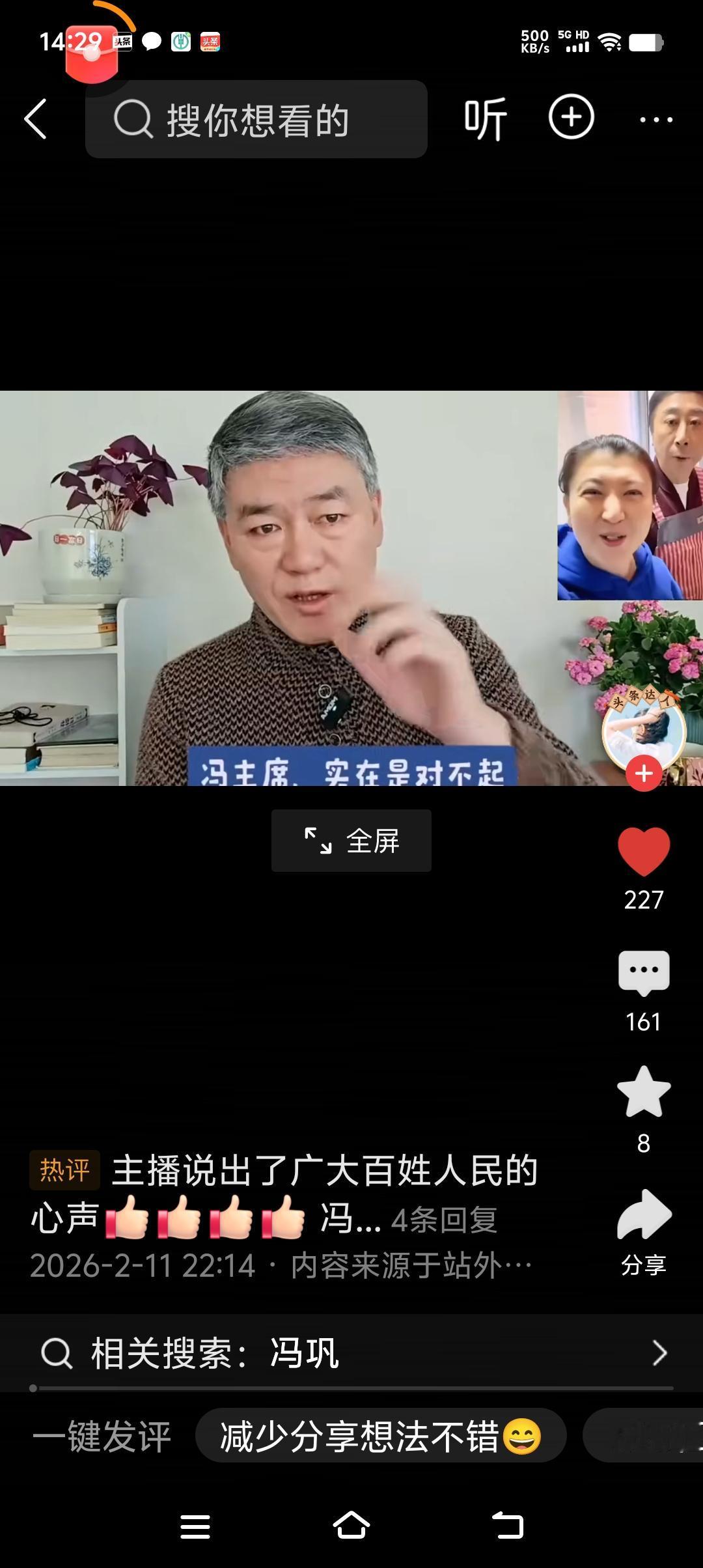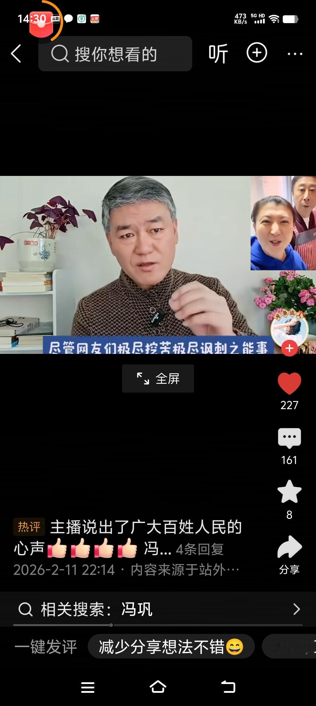 一位主播喊话冯主席! 主播认为 他每天拍一些夫妻日常生活的段子确实有些掉价! 原因如下: 第一、不好玩也不好笑, 既然不好玩,也不好笑,还没有啥教育意义,拍它有什么用? 第二、 他拍的上百条视频中都是和那个演员秘密的家庭琐事, 与他主管的业务有关联的20条不到, 让人感觉到这是不务正业! 第三、主播让冯主席看看他拍的段子的评论区,确实挺热闹,是骂声一片, 更让人不解的是他依然我行我素把大伙的评论当做耳旁风根本不理睬! 作为曲协的一位领导,是不是应该把精力放在 培养新人推出更有正能量的好作品, 而不是每天油嘴滑舌拍一些没有什么意义的,腻腻歪歪的东西! 干啥琢磨啥,干啥吆喝啥,这个道理人家比我们懂,可是,他的行为让人觉得他好像不懂! 那位闫大妈总爱说掉价这个词,这回让主播放在了她和她的领导搭档上了! 大家认为主播说的是不是实话?