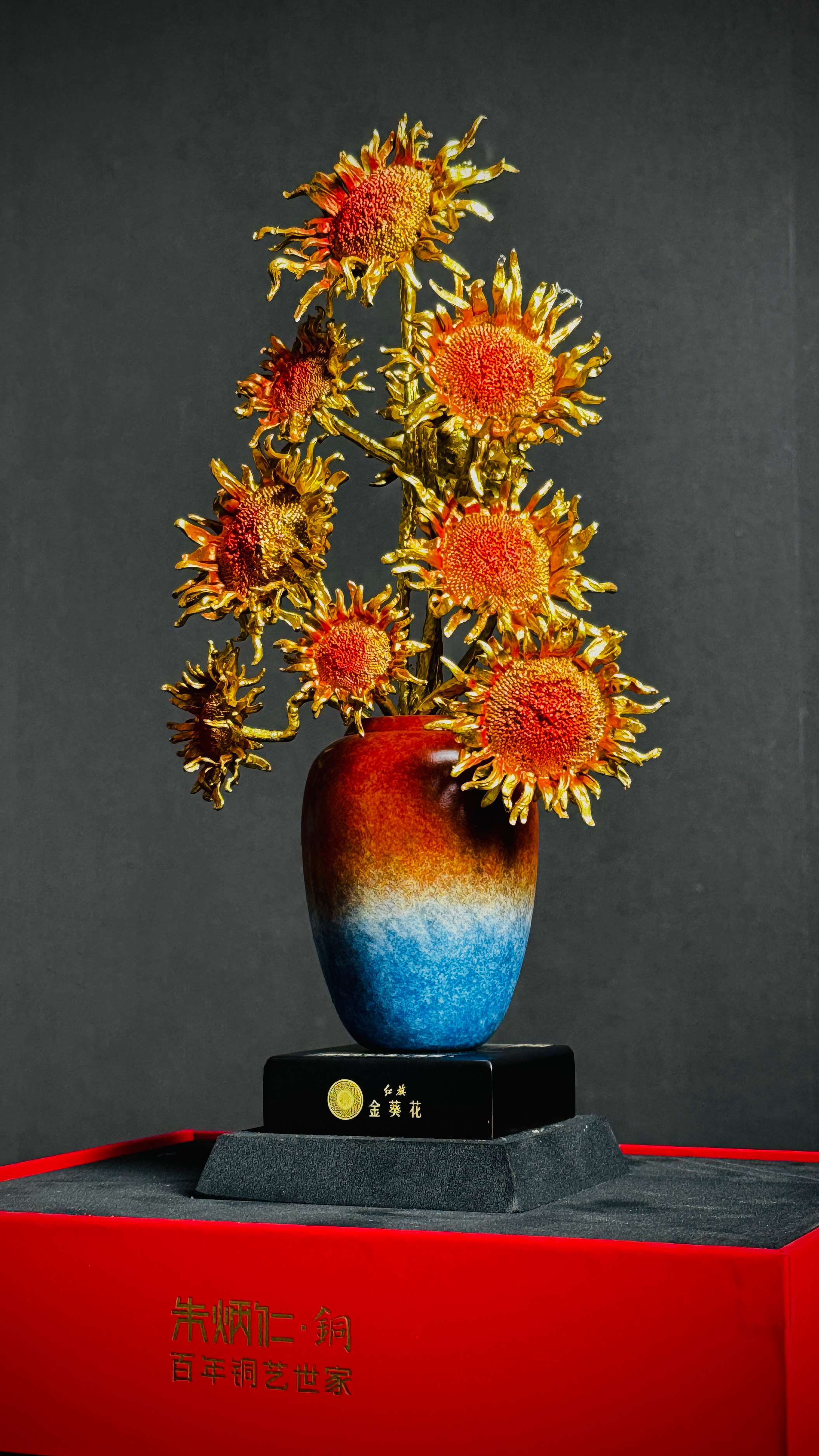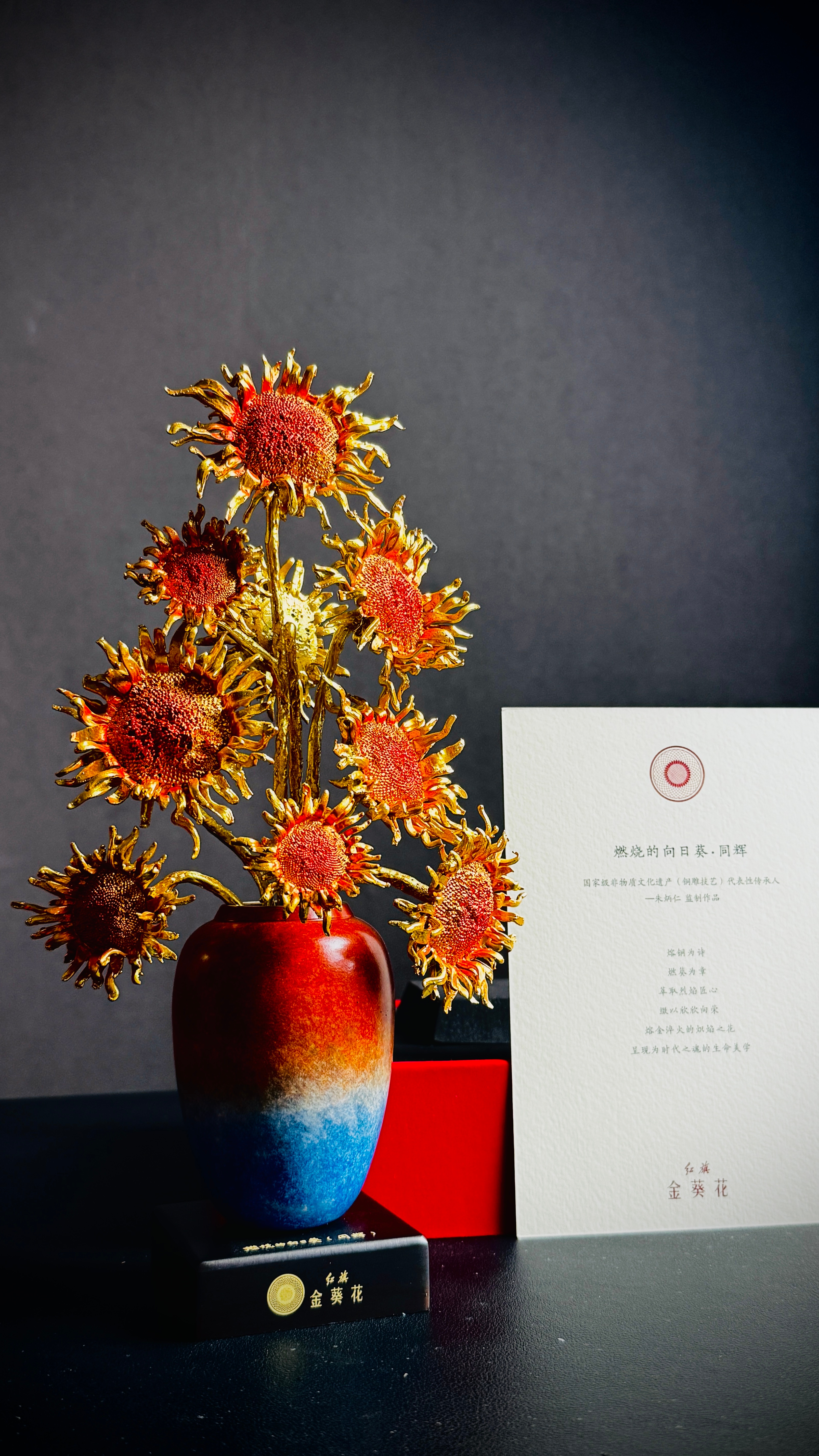 来自红旗金葵花的礼物:《燃烧的向日葵-同辉》。由国家级非遗铜雕技艺传承人、故宫博物院文创顾问朱炳仁先生设计,和金葵花一样精美独特! 大v聊车保罗车闻