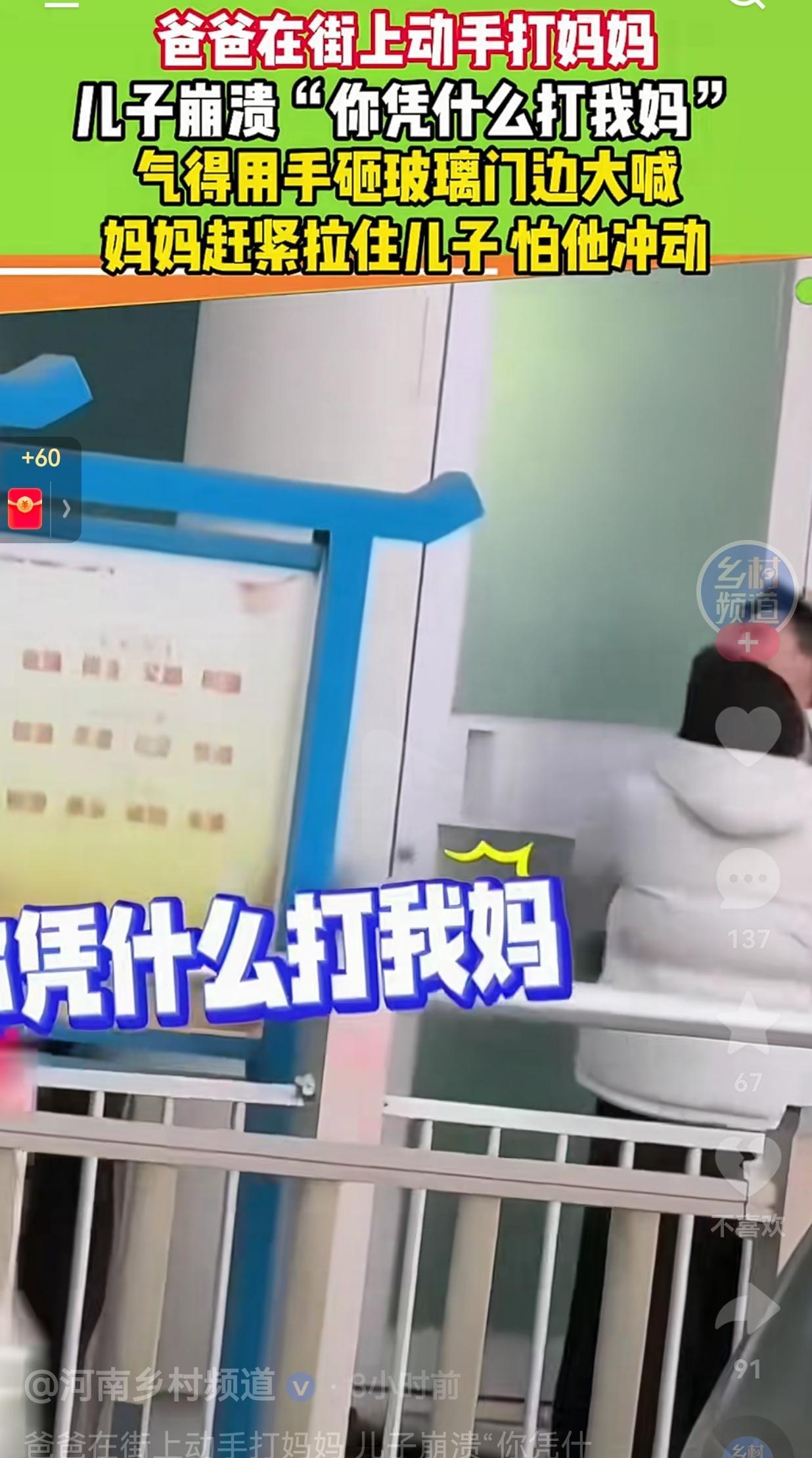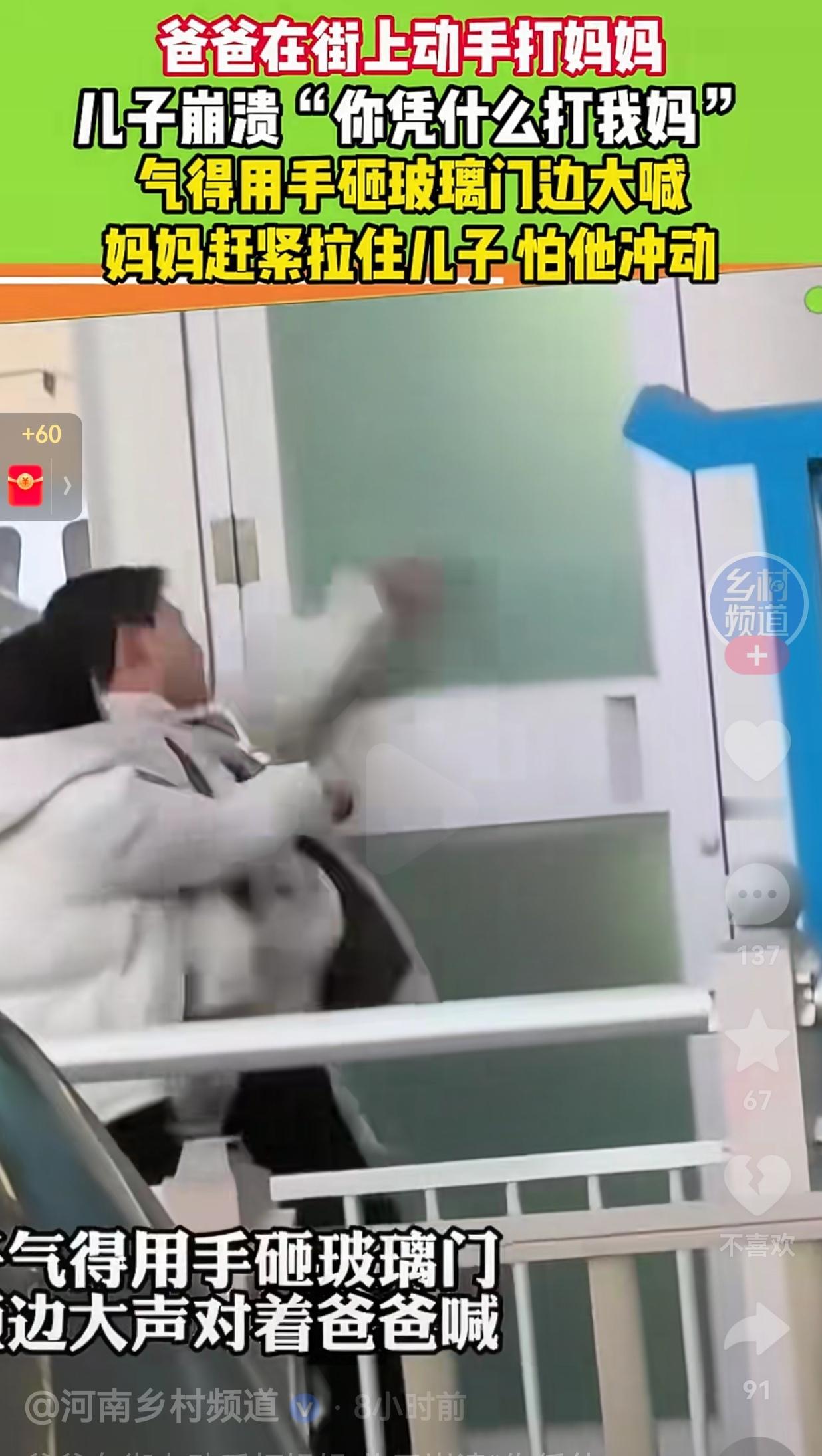 孩子真的是妈妈的铠甲!我想妈妈在这一刻,肯定是幸福的!街头人来人往,一对夫妻不知什么原因,吵了起来,男人脾气太暴躁了,突然抬手,狠狠扇了女人一巴掌。 就在这一秒,旁边一个穿白羽绒服的小伙子,像被点燃的炮仗一样炸了。这个小伙子不是别人,正是这对夫妻的儿子。 他红着眼,嘶吼着冲上去,拳头狠狠砸在旁边的玻璃门上,指节都红了,对着他爸吼:“你凭什么打我妈!凭什么!” 那声音,是从胸腔里挤出来的,带着哭腔,又带着一种不容侵犯的狠劲。 妈妈吓坏了,死死抱住儿子,把他往身后拉,一边哭一边劝:“别冲动,别冲动……” 而那个动手的男人,手插在兜里,面无表情,像个没事人一样,转身就走了。 网友看到后评论说:“这孩子没白养,他是真的在护着妈妈。” 也有的网友说: “我小时候我爸打我妈,我躲在桌子底下发抖,现在想想真恨自己当时太懦弱。” 还有的网友说:“最让人心疼的是妈妈,她自己受了委屈,还在拼命护着儿子,怕他冲动闯下大祸。” 很多妈妈为了孩子,一辈子都在忍,她们觉得忍忍就过去了。 可是,她们不知道是,孩子什么都懂。你受的委屈,你掉的眼泪,你咽下的气,孩子全都看在眼里,记在心里。 平时是妈妈护着孩子,可真看见妈妈被欺负了,孩子真的会瞬间长成铠甲。 他可能不够强大,可能还会被拉住,可能只会砸一下玻璃,可那是他全部的勇气。 通过这事也给我们提了个醒:家暴从来都不是家务事,真的很伤人,更是伤孩子。尤其是妈妈当着孩子的面动手打老婆。 你这样做,打在伴侣身上,疼在孩子心里,甚至会变成他一辈子的阴影。 所以,夫妻有矛盾很正常,有矛盾可以解决,但是,绝对不能通过拳头解决。拳头除了给家人带来伤害之外,其他的什么问题也解决不了。 大家觉得呢?欢迎评论区留言。