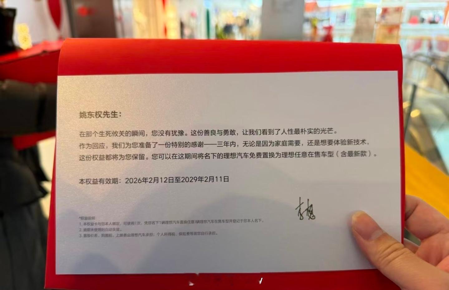 前阵子理想车主姚先生路过大桥,毫不犹豫救下轻生女子,事后悄悄离开,深藏功与名。李想不仅亲自赶到当地请车主一家吃饭,更送出三年任意车型免费置换特权。还有亲签感谢信,是谁慕了我不说。