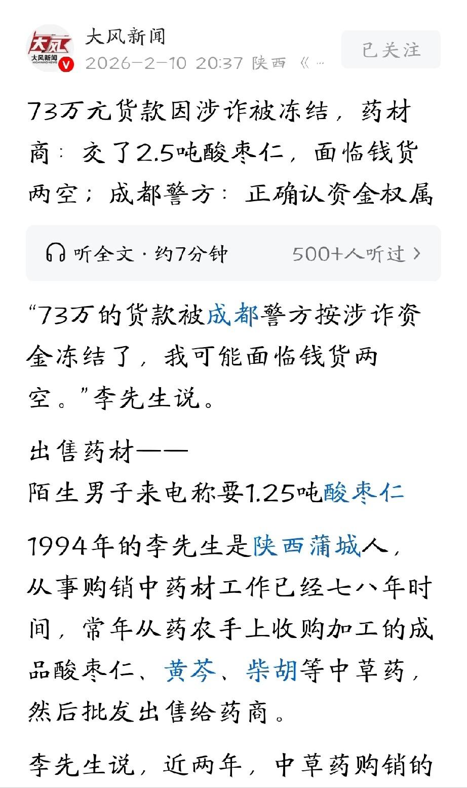 🌙陕西渭南,男子从事中药材购销工作,有个大客户要购买2.5吨酸枣仁,他喜出望外,不仅交付了自己库存的1.25吨酸枣仁,还从朋友那里购买了1.31吨酸枣仁,一共收到73万货款。不料,第二天他的账户竟然被外地警方冻结,货款也成了涉诈资金,男子主动给警方说明情况,谁知,警方的说法让他彻底傻了眼。 张先生做中药材购销生意已经有八年时间,平时都是靠老客户介绍生意,而酸枣仁最近几年行情一直不错,因为野生资源日渐匮乏,家种产量又跟不上,市场价格逐年上涨,2026年一季度亳州市场的98货价格已经突破350元/公斤,张先生也靠着常年收购、囤货,积累了一些库存。 前段时间,张先生突然接到一个陌生电话,对方自称是做中药材批发的大客户,说自己公司急需2.5吨酸枣仁,用于下游药企供货,还询问了张先生的报价和供货能力。 张先生一听瞬间喜出望外,要知道,2.5吨酸枣仁可不是小订单,按照当时的市场价格,这笔订单能让他赚不少,而且对方态度很爽快,没过多讨价还价,就和他敲定了合作细节,约定好先付全款,张先生再安排发货。 挂了电话,张先生立刻盘点自己的库存,发现自己手里只有1.25吨酸枣仁,距离客户要的2.5吨还差一半多。他不想错过这个大客户,就赶紧联系了自己多年的朋友李某,两人沟通后,张先生以市场价从李某手里收购了1.31吨酸枣仁,加上自己的库存,刚好能满足客户的需求,甚至还多了一点余量。 当天下午,张先生就收到了客户转来的73万货款,确认款项到账后,他马不停蹄地安排打包、发货,联系了专门的物流,将所有酸枣仁按时发给了客户,全程都留存了打包视频、物流单据和交易记录。看着物流车出发,张先生心里一块石头落了地。 可他万万没想到,第二天一早,张先生像往常一样,准备去周边的药材市场收购酸枣仁,刚到市场,他就发现自己的银行卡无法正常支付,去银行查询后才得知,他的账户被外地一家公安局冻结了,冻结原因是账户收到了涉诈资金,而那笔73万的货款,正是涉案款项之一。 这个消息如同晴天霹雳,张先生一下子就慌了神,他做的都是正经生意,从来没接触过诈骗,怎么会收到涉诈资金。他赶紧回家,整理好所有的交易凭证,主动联系了冻结他账户的外地警方,一五一十地说明了自己的正常交易情况,反复强调自己也是受害者,希望警方能核实情况。 张先生本以为,只要自己能提供完整的交易证明,证明这笔73万的货款是正常的中药材交易所得,和诈骗无关,警方就会尽快解冻账户。 可警方的回复,却让他更加无语,也更加绝望。警方表示,目前案件还在侦查阶段,虽然张先生提供了相关交易凭证,但无法完全排除他和诈骗案件的关联,也不能确认他是否知情。 警方还明确告知张先生,账户冻结期间,无法解冻,也不能提取账户内的任何资金,只能等到案件侦查结束,确认这笔73万货款确实和诈骗案件无关,且张先生没有任何过错后,才能办理解冻手续。至于案件什么时候能侦查结束,警方并没有给出明确的时间,只说要看案件的复杂程度,可能需要几个月,也可能需要一年以上。 张先生这下彻底懵了,他不仅已经把所有酸枣仁发给了客户,还垫付了从朋友那里收购酸枣仁的钱,如今账户被冻结,73万货款取不出来,生意也无法正常开展,每天还要承担各种开支,甚至面临着钱货两空的境地。他多次联系警方询问案件进展,可每次得到的都是同样的回复,没有任何实质性的进展。 其实,张先生遇到的这种情况,在中药材购销行业并不是个例,有些诈骗分子会利用正规商家的交易渠道,将诈骗所得的资金转到商家账户,再通过交易的名义掩盖诈骗痕迹,导致正规商家无辜受累。 按照相关法律规定,公安机关为了侦查犯罪,有权查询、冻结涉案资金,哪怕是无辜商家收到的正常交易货款,只要涉及涉诈资金,也会被临时冻结。 张先生现在的处境十分艰难,他一边要继续和警方沟通,反复提交相关证明材料,等待案件侦查结果;一边要应对生意上的困境,因为账户被冻结,无法正常收付款,很多老客户都不敢再和他合作,新客户也无法拓展,就连之前从朋友那里收购酸枣仁的货款,都还没完全结清。 他手里的所有凭证,都能证明自己的交易是合法合规的,可就是因为收到了被诈骗分子利用的货款,就陷入了这样的困境。他不知道自己还要等多久,也不知道最后能不能顺利解冻账户、拿回货款,更不知道这段时间的损失该如何弥补。 张先生做的是正经的中药材生意,勤勤恳恳多年,却因为一场无关的诈骗案,面临钱货两空、生意停滞的局面。 那么大家觉得,警方这样的处理方式合理吗?无辜的商家收到涉诈资金,该如何才能快速解冻账户、减少损失?不妨留下你的观点,一起讨论。