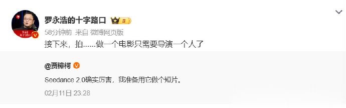 马斯克在其社交平台X转发评论Seedance2.0相关推文,并表示模型发展速度太快(It'shappeningfast)。贾樟柯微博发文感叹:“Seedance2.0确实厉害,我准备用它做个短片。”罗永浩随即转发,并配文称:“拍……做一个电影只需要导演一个人了。”
