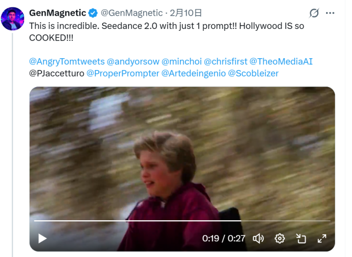 Seedance2.0凭借多模态创作方式、自带运镜的呈现效果,迅速在全球范围内引发高度关注。海外社交平台上,不少用户称赞其生成效果媲美好莱坞大片,相关话题迅速冲上热门,多条演示视频播放量破百万。
