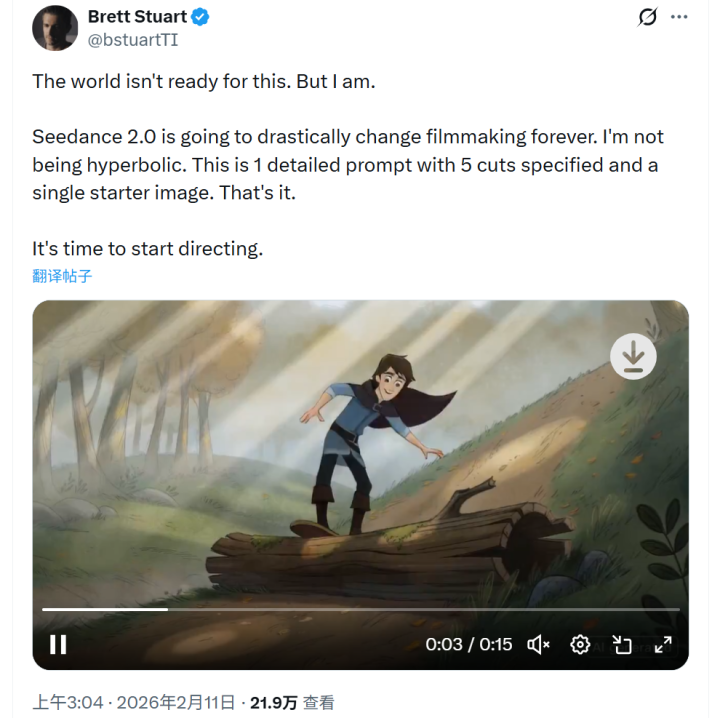导演BrettStuart发布了一条15秒的动画短片,是一个少年跟小狗在树林追逐的故事,包括少年和小狗的对话以及紧凑的动作。BrettStuart表示,“世界还没准备好迎接这个。但我已经准备好了。Seedance2.0将彻底改变电影制作的未来。我可不是在夸张。这只是一个包含5个镜头设定和一张起始图像的prompt。就这么简单。”