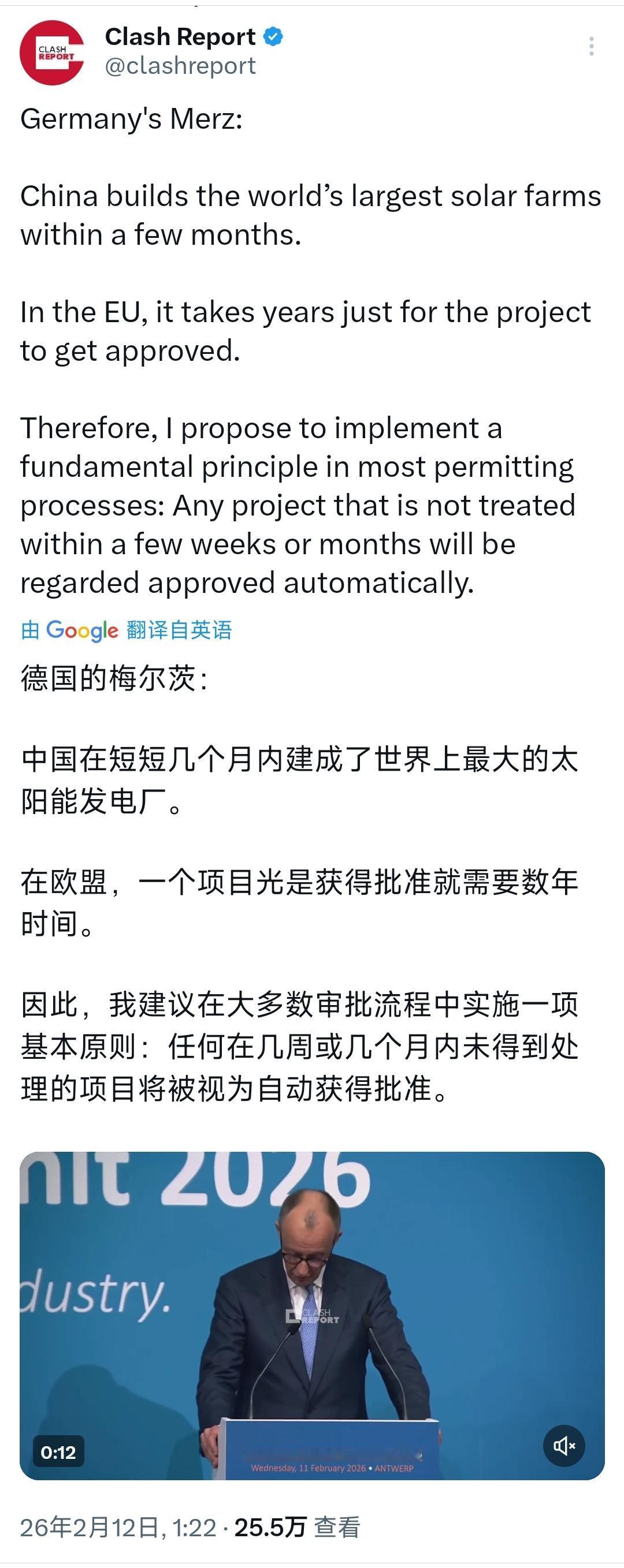 德国总理默茨在欧洲工业峰会上表示:“中国在短短几个月内建成了世界上最大的太阳能发电厂。在欧盟,一个项目光是获得批准就需要数年时间。因此,我建议在大多数审批流程中实施一项基本原则:任何在几周或几个月内未得到处理的项目将被视为自动获得批准。” 都忘不了,过去几十年,德国乃至整个欧盟,都是我们中国认认真真学习的榜样,德国制造的严谨、欧盟治理的规范,在全世界都是响当当的名片,流程清晰、办事高效、不糊弄不拖沓,靠着这套务实的作风,欧洲牢牢站在全球工业的顶端,不管是汽车、机械还是化工,都代表着最高水准。 那时候我们学德国的工匠精神,学欧盟的管理经验,就是看中他们能把规范和效率结合得恰到好处,既不盲目求快,也不被条条框框绑住手脚。 可谁能想到,不过短短十几年,曾经的效率标杆彻底走偏了,严谨变成了死板,清晰的流程变成了绕不完的迷宫,层层审批、多方博弈、过度监管,把曾经雷厉风行的欧洲,拖进了低效的泥潭里拔不出来。 一个普通的新能源项目,光是走审批流程,平均就要耗上 4.5 年,德国的陆上风电项目审批平均要 5.8 年,有的州甚至拖到 44.7 个月,接近 4 年。 海上风电项目更夸张,审批加并网最长要 9 年,一个项目还没开工,几年时间就没了,等审批下来,市场早就变了天,技术都更新了好几代,原本能抓住的新能源机遇,硬生生被拖沓的审批拖成了泡影。 默茨看得比谁都清楚,中国用几个月走完的路,欧盟要花好几年,这样的效率差距,怎么可能在全球竞争中站稳脚跟。 为什么曾经高效的欧洲会变成这样?说白了就是太折腾,太把流程当目的,反而忘了做事的根本是发展。 欧盟有 27 个成员国,一个项目要过欧盟委员会的关,要过成员国的关,还要过地方政府、环保组织、工会的关,每一关都有不同的利益诉求,每一关都能挑出毛病,谁都不想拍板,谁都怕担责任,最后就变成了所有人都在走流程,没有人真正为项目落地负责。 再加上过度的环保监管,哪怕是建清洁能源电站,都要反复论证对昆虫、对土壤、对鸟类的影响,论证来论证去,几年时间就没了。 德国更是把严谨变成了过度较真,一个文件要签十几个章,一个流程要走十几个部门,好好的项目拖得没了脾气,企业耗不起、等不起,只能选择离开。 这种低效的后果,已经实实在在砸在了欧洲人的头上,欧洲的工业成本越来越高,新能源上不去,电价居高不下,德国的汽车企业、化工企业,这些曾经的欧洲骄傲,因为国内审批慢、成本高,只能把新产能搬到中国。 在中国建工厂、上项目,几个月就能投产,效率高、成本低,产品还能快速供应全球市场,2025 年德国多家知名车企都宣布扩大在华投资,理由很简单,在中国能抓住市场机遇,在德国本土,等审批下来,竞争对手早就占领市场了。 对于普通老百姓来说,欧洲的新能源转型慢,电费越来越贵,冬天取暖、夏天用电都要精打细算,而中国的光伏电站遍地开花,电价稳定,新能源普及到农村家家户户,这就是效率带来的实实在在的好处,也是效率差距带来的最直观的不同。 默茨作为德国总理,敢在欧洲工业峰会上说这样的大实话,是真的急了,他清楚地知道,欧盟和德国再这样被低效的审批绑着,别说追赶中国,就连自己现有的工业优势都保不住。 他提出的 “逾期自动批准”,不是要放弃规范,而是要打破流程的枷锁,把效率找回来,可惜的是,欧盟积弊太深,27 个国家各有各的想法,各方利益缠缠绕绕,想要改掉几十年形成的拖沓毛病,难如登天,就算默茨喊破了嗓子,想要真正实现提速,也不是一朝一夕的事。 咱们老百姓都明白一个最简单的道理,不管是过日子还是干事业,最怕的就是拖,拖一天就少一天机遇,拖一年就丢一年优势。 早年德国的好,好在既规范又麻利,现在欧洲的差,差在只有流程没有效率,就像家里盖房子,这边材料备齐、工人到位,几个月就能住进去,那边光批手续就批了好几年,等手续下来,家人都等急了,市场也变了,这就是最直白的差距,也是最残酷的现实。 默茨的话,给全世界都提了个醒,效率永远是竞争力的核心,规范和流程是为了把事做好,不是为了把事拖住。 曾经我们以德国和欧盟为榜样,学习他们的严谨与高效,现在风水轮流转,中国靠着实干、高效、不折腾,在新能源等领域跑出了中国速度,而曾经的榜样却陷入了流程的泥潭难以自拔。 这不是说欧洲不好,而是说明一个道理,任何制度、任何流程,都要跟着时代变,跟着发展走,一旦变成束缚发展的枷锁,再光鲜的过去,也挡不住衰落的趋势。 欧洲想要找回竞争力,第一步就是放下架子,踏踏实实学学中国的实干效率,别再让层层审批耽误了发展的大好机遇,毕竟,市场不等人,时代不等人,效率跟不上,再完美的流程,也只是一纸空文,再辉煌的历史,也只能变成回忆。