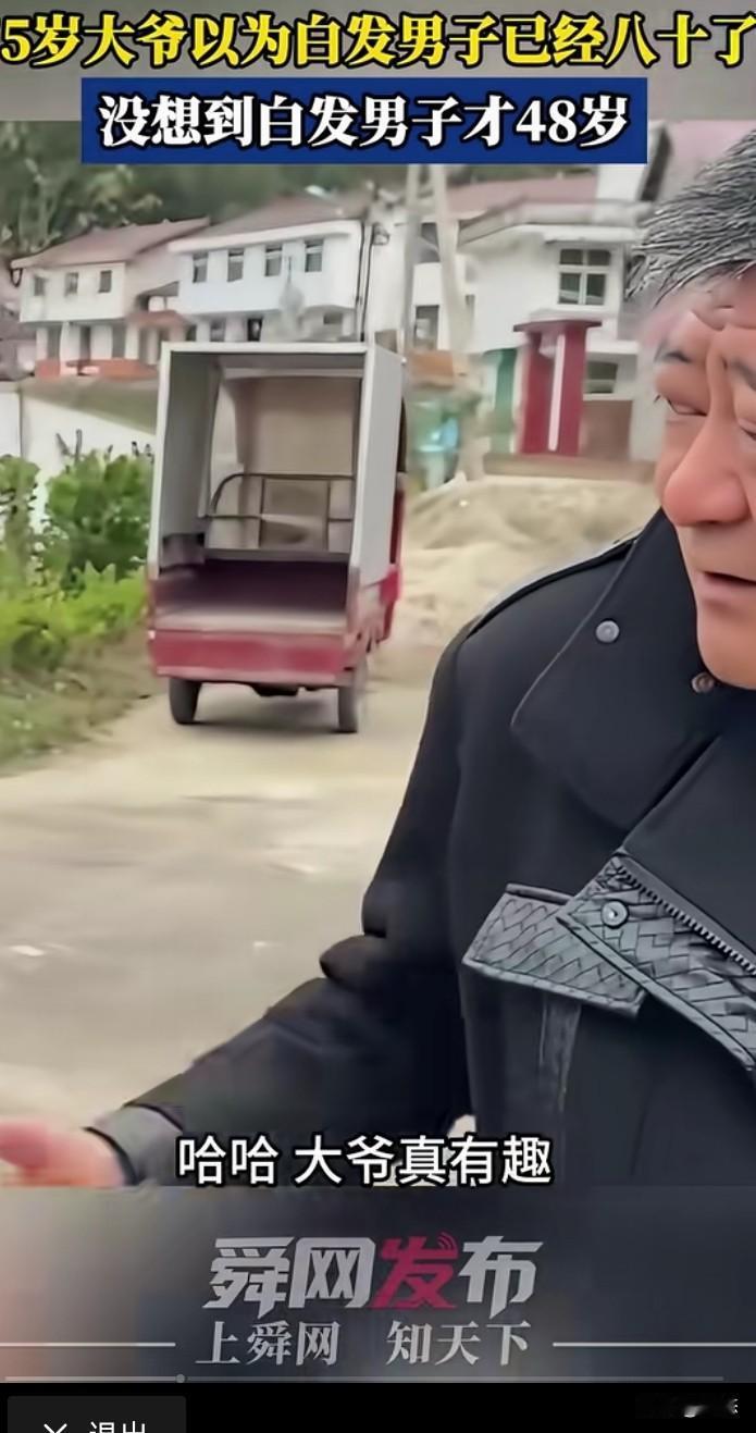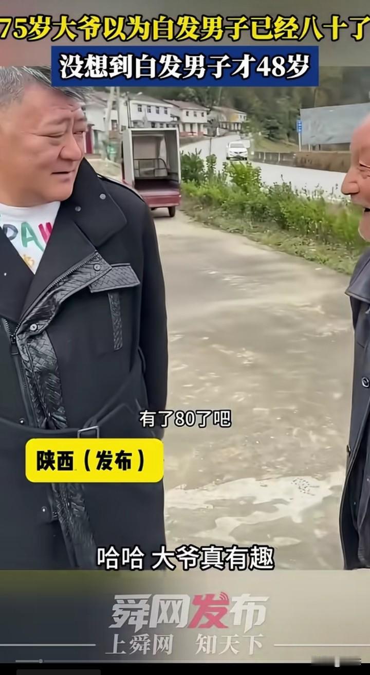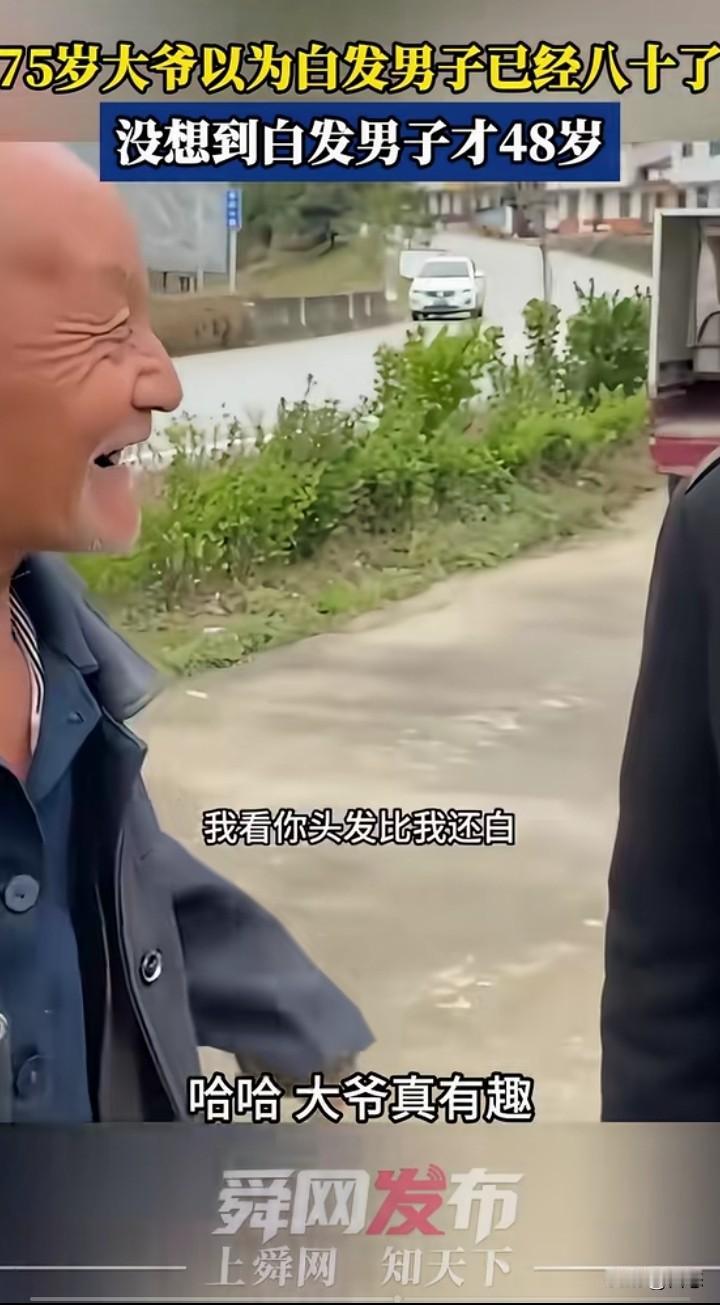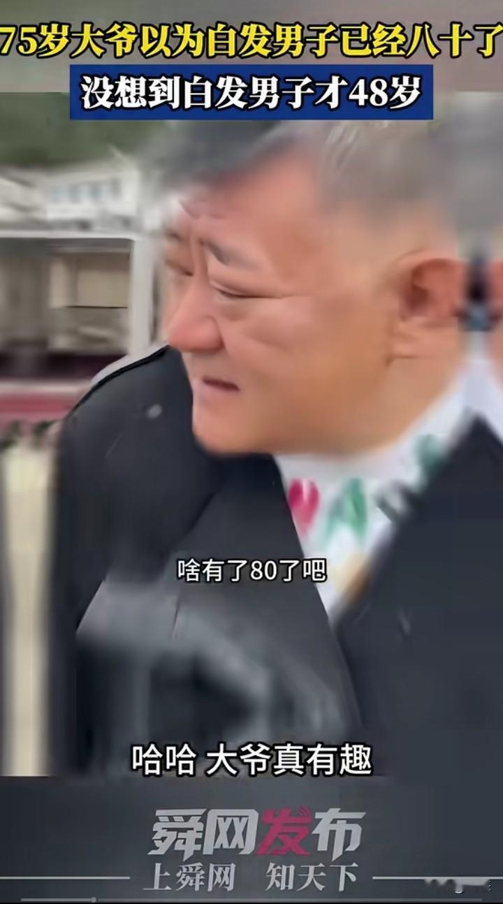 75岁大爷在路边看到一位白发苍苍的男子,大爷以为男子80岁了,大爷问男子有没有80岁,男子哈哈大笑,说大爷真有趣,男子称自己才48岁。大爷也笑哈哈的,看你头发那么白,以为是80岁。 看到男子本人后,80岁都说少了,难怪让人误会的。 有些人模样年轻实际上年纪很大,有些人模样老陈,实际上很年轻,所以说人不可貌相。 你们有没有遇到过这样的人呢?