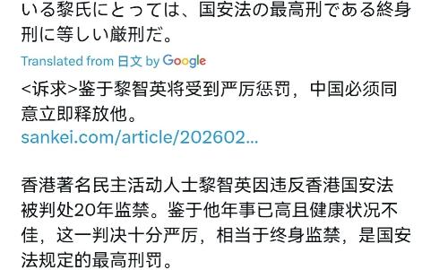 日媒对我们进行批评!2月12日,日本产经新闻刊文声称,香港“著名民主活动”人士黎智英(78岁)因违反香港国家安全法被判处20年监禁。对于年迈体弱的黎先生而言,这相当于无期徒刑,是《国家安全法》规定的最高刑罚。这是一项出于“政治动机”、符合中国意愿的判决,完全不可接受。我们要求立即释放黎先生。 黎智英这号人物可不是普通“民主活动家”。作为香港壹传媒创始人,他早年靠八卦小报起家,后来却成了反中乱港的“急先锋”。 香港国安法实施后,他被指控勾结外国势力危害国家安全,这可不是空穴来风——证据显示,他多次与美国政客密会,接受境外资金支持,甚至推动所谓“制裁”香港官员的议案。这些行为,哪一条都踩了香港国安法的红线。 香港司法机关这次判决可没含糊。法庭审理时严格遵循法律程序,证据链清晰完整,量刑时还考虑了黎智英的年龄和健康状况。 国安法规定,勾结外国势力危害国家安全罪最高可判无期,20年刑期既符合法律量刑标准,又体现了“过罚相当”的原则。日媒却选择性忽视这些细节,张口闭口“政治动机”,这不是睁眼说瞎话吗? 再说日媒的“正义感”从何而来。日本近年对华动作频频,从插手台湾问题到在南海搞小动作,哪次不是跟着美国后面起哄?这次炒作黎智英案,表面上是“关心香港民主”,实则是想借香港议题牵制中国发展。这种“以港遏华”的老套路,早被国际社会看穿了。 中国政府的态度一直明确:香港事务纯属中国内政,任何外部势力无权干涉。香港国安法实施以来,香港社会秩序明显改善,经济逐步恢复,这正是法律威慑力的体现。 黎智英案的判决,不仅是对他个人犯罪行为的惩罚,更是对所有危害国家安全行为的警示——谁敢勾结外部势力分裂国家,谁就要付出沉重代价。 日媒可能忘了,中国早不是百年前任人欺凌的旧中国。如今的中国,有强大的经济实力作后盾,有先进的军事力量作支撑,更有14亿人民维护国家统一的坚定意志。 在涉及核心利益问题上,中国从不会妥协退让。就像当年甲午海战、九一八事变时,忍让换不来和平;现在国力强盛了,更不会重蹈覆辙。 黎智英案的判决,恰恰体现了中国“底线思维”的智慧——既坚持和平发展道路,又坚决维护国家主权。 这种“软硬兼施”的策略,既赢得了国际社会的理解,又震慑了潜在挑衅者。那些试图跟风挑衅的势力,看到带头闹事的日本都碰了钉子,自然会掂量后果。 日媒的批评,反而暴露了其自身在涉及中国内政问题上的双重标准。他们口口声声“关心民主”,却对黎智英勾结外部势力的铁证视而不见;他们高喊“释放黎智英”,却对香港市民渴望稳定的心声充耳不闻。这种虚伪的“正义”,国际社会早已不买账。 香港国安法的实施,是香港由乱及治的“定海神针”。黎智英案的判决,更是向世界传递明确信号:中国维护国家安全的决心坚定不移,任何分裂国家的图谋都注定失败。 那些想靠炒作香港议题干扰中国发展的势力,还是趁早收起这套把戏——中国的发展大势不可阻挡,任何挑衅都将自食其果。
